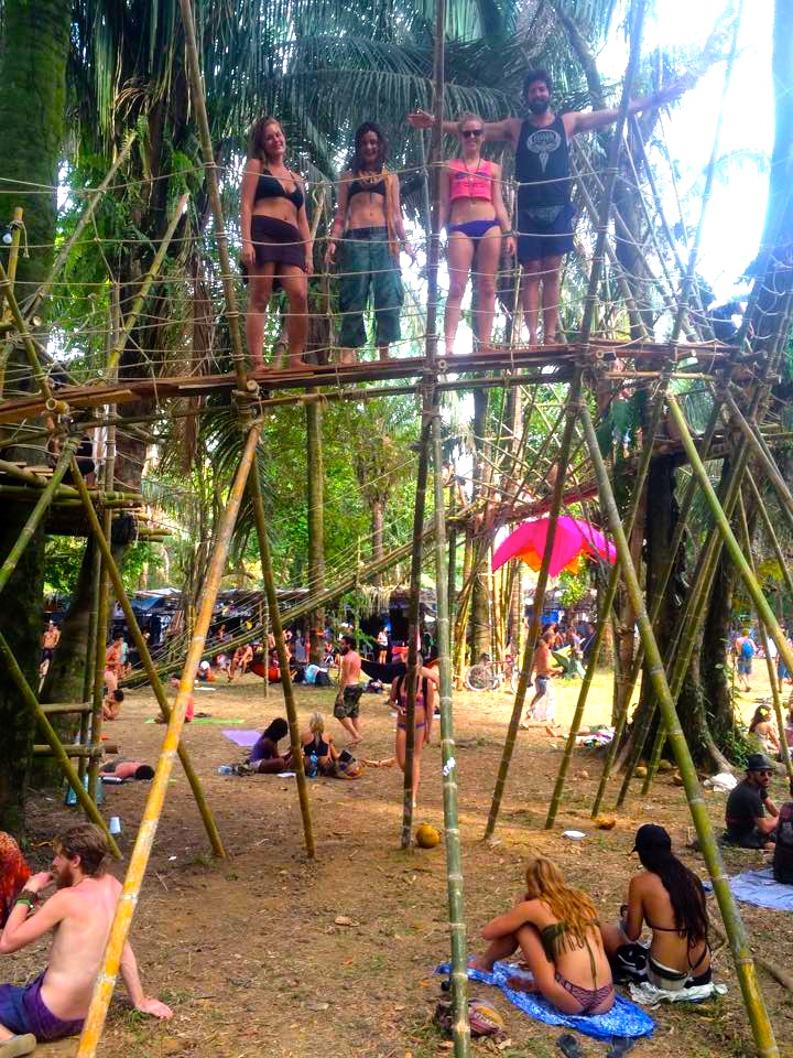 The grounds were amazing. We were in the jungle, but much of the land had been cleared and it was mostly grassy with huge trees scattered around, most of them on the outside acting somewhat as a border for the grounds. Everything was lush and green, and the ocean was a one minute walk through a rabbit hole like pathway. There were 2 huge main stages, and two smaller stages. The main stage, Luna, was encompassed by a structure of a jaguar sitting in lotus position, with two sets of hands in chin mudra. There were intricately built jungle like gym structures of wood that you could climb atop to reach platforms to watch the stage from or listen to the howlers monkeys from, a plank like walkway with railings connecting one to another, with hammocks strung here and there on the lower sections. The bathrooms were compostable outhouses who’s walls were built from black mesh material that helped keep the smells down. The main street where the food market and vendors were was nicely laid out with another structure in the center for people to play in. Acro yoga workshops were offered here so you could fly and then grab a smoothie and life changing falafel afterwards. A huge slide made of wood and bamboo was erected and you had to climb up the jungle gym like structure stairs on one side and make the long walk across the thin plank structure to get the slide. You grabbed a potato sack and sent yourself flying down the slide squealing with delight while the yogis practiced putting their flyers into throne position below.