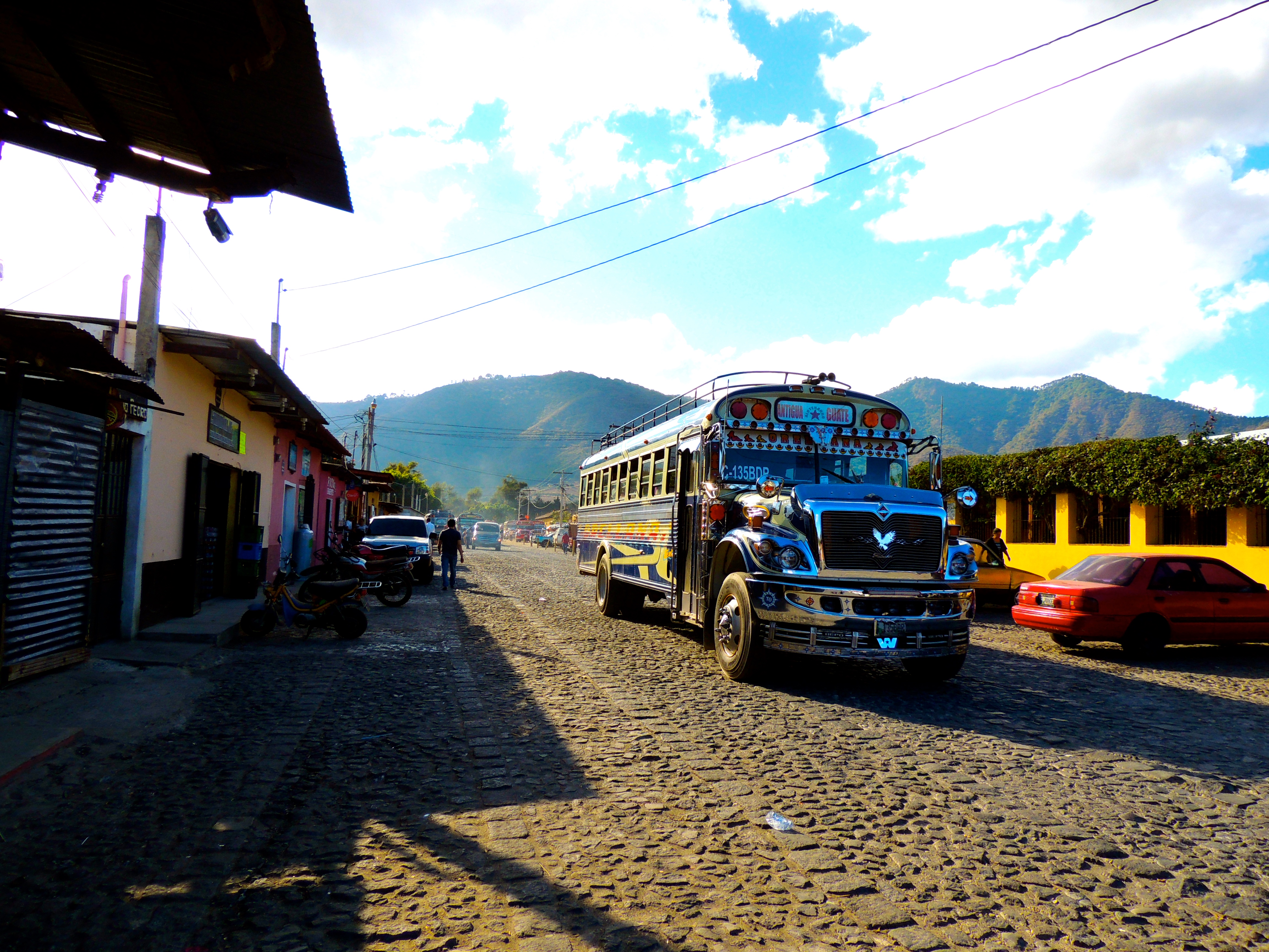 I got ahold of myself after a minute and then began pushing back and making my way towards Kajsa and grabbed her arm and made sure I didn’t let go. The yelling kept increasing and our cab driver still hadn’t opened the trunk to get our bags. In retrospect I wonder if he was waiting for us to change our minds and ask him to take us elsewhere- like to a real bus depot. But we stuck to our guns and I asked for our bags. As soon as he opened the trunk they began reaching for our bags and trying to take them from us so we would have to follow them. I asserted myself, my protective instincts for my backpack and my entire life inside of it kicking in, and grabbed my bags telling them to back off. Kajsa and I talked to each other by yelling over the rest of them, even though we were standing right next to each other, and picked one of the yelling hawkers and went with him as he promised the lowest price. We walked across the street and saw the ghetto chicken bus we would be taking. It looked nothing like the beauties we saw in Antigua, with their shining chrome, beautiful names and bright paint jobs. This was an old bus, faded and worn.