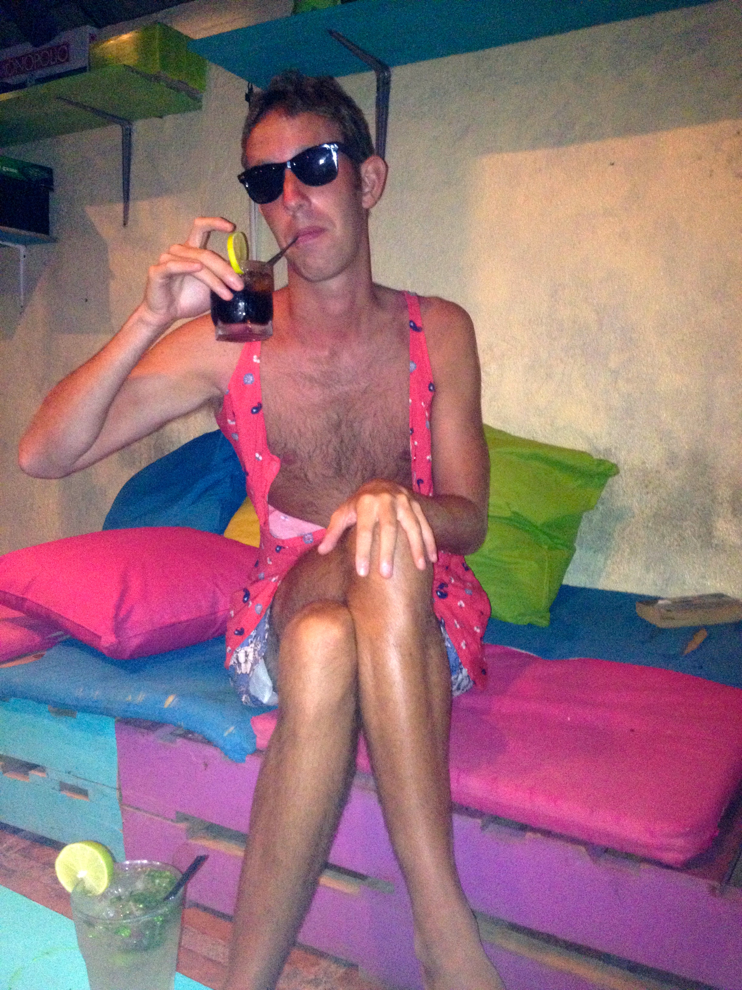After a while we went to wake Richard up from his beachside slumber and found him wearing Sarah’s dress around his neck. I guess he had gotten a little cool during nap time. He stumbled around and put the dress on properly, adjusted his sunglasses to keep the glare of the hostel lights out of his eyes and asked us, in his northern London accent if we thought he ‘looked Prit-ee”. We spent the rest of the night howling with laughter at Richard and his antics. At bed time, Richard locked himself out of our dorm, and we could hear him through the wire mesh wall trying to get in. Fearing he had broken his key off in the lock, he went to get help, but only made it a step or so before taking a tumble into the bushes. I don’t think he quite had the energy to get up, so he just hung out there until one of the workers happened by with a flashlight. Imagine his surprise when his light shines upon Richard, a full grown British bloke, in the bushes, in a dress. As the light reflects off Richard’s sunglasses, and the man asks if he is okay, all Richard says is “Do you think I look Prit-ee?” and a cascade of laughter explodes from our dorm room. And all this, before 9pm.