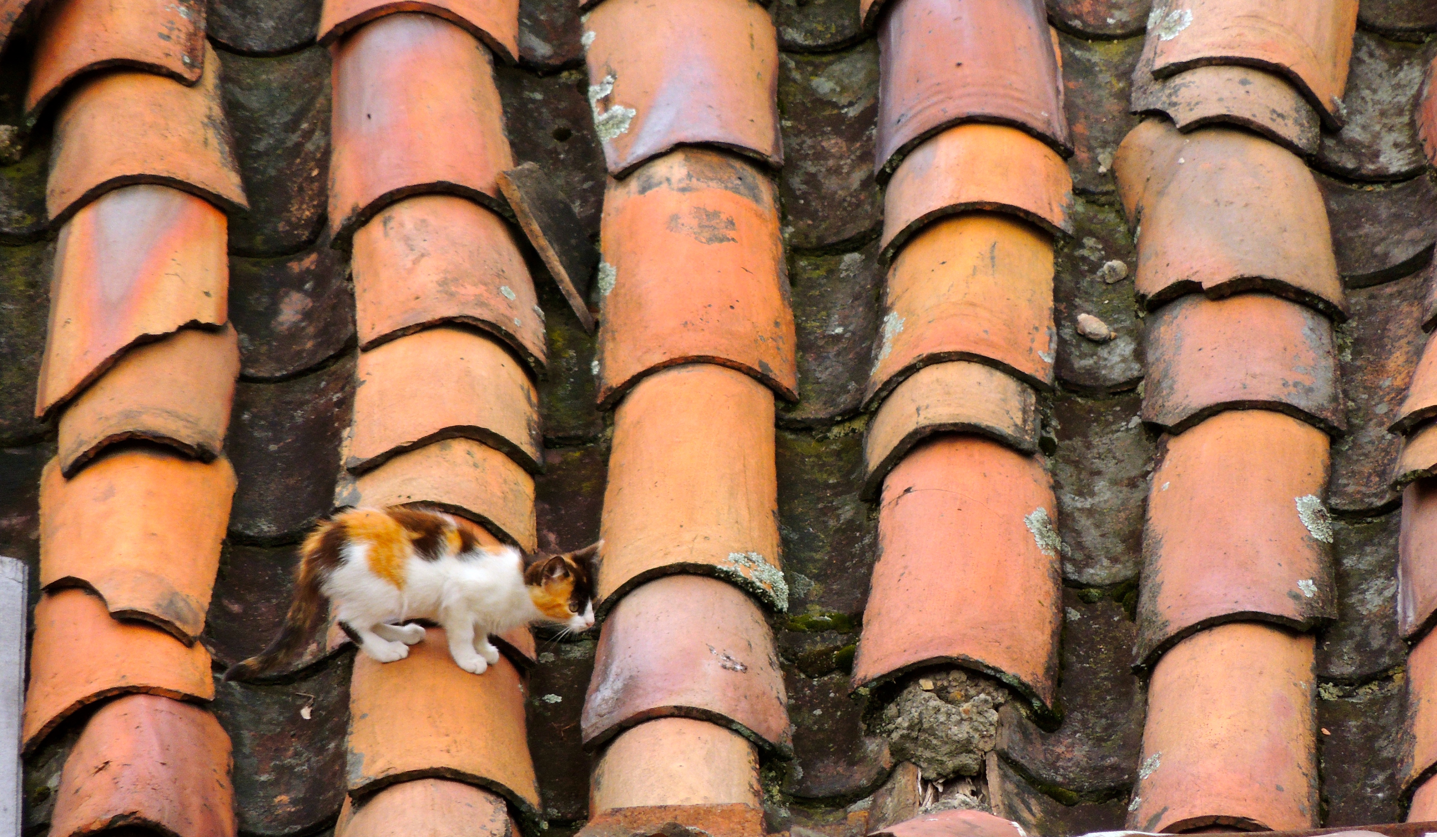 A kitten from a new litter tentatively explores the red clay roof tiles in Bogota.