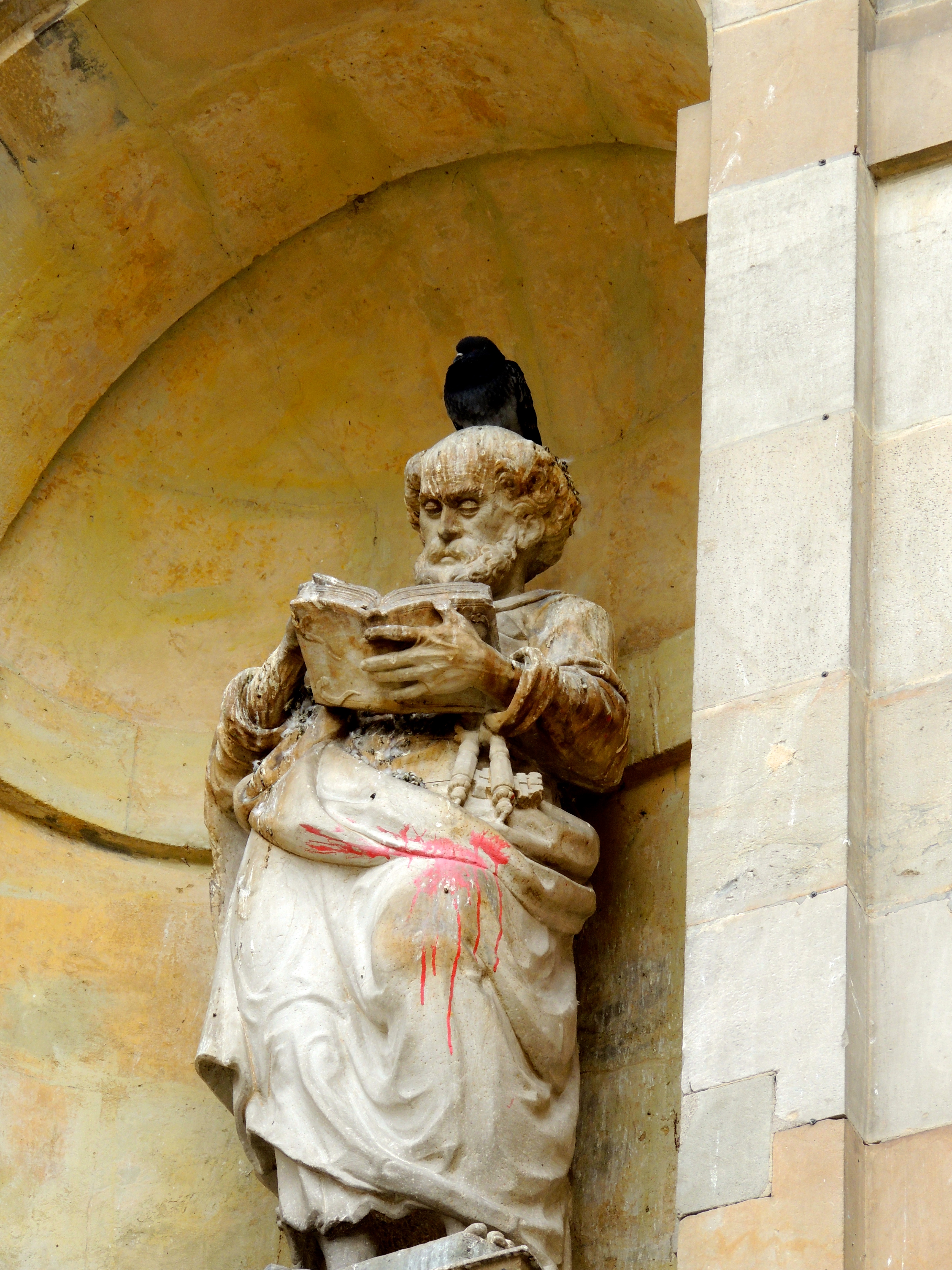 A pigeon roosts on the head of the Cathedral statue. Remnants of paintball explosions cover his robes.