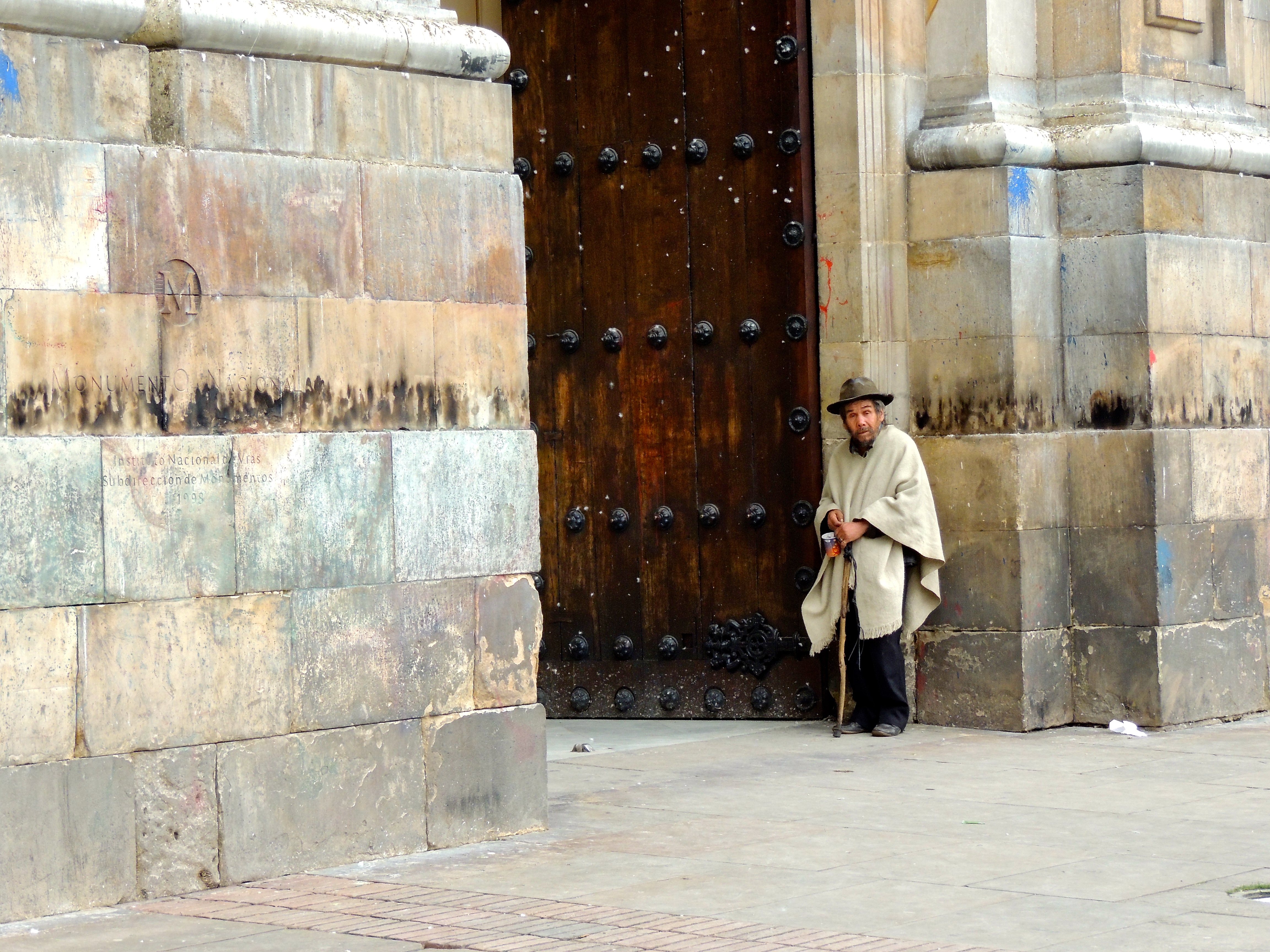 A local man in traditional dress stands outside the thick wooden doors of the Catedral de Bogota in the plaza.