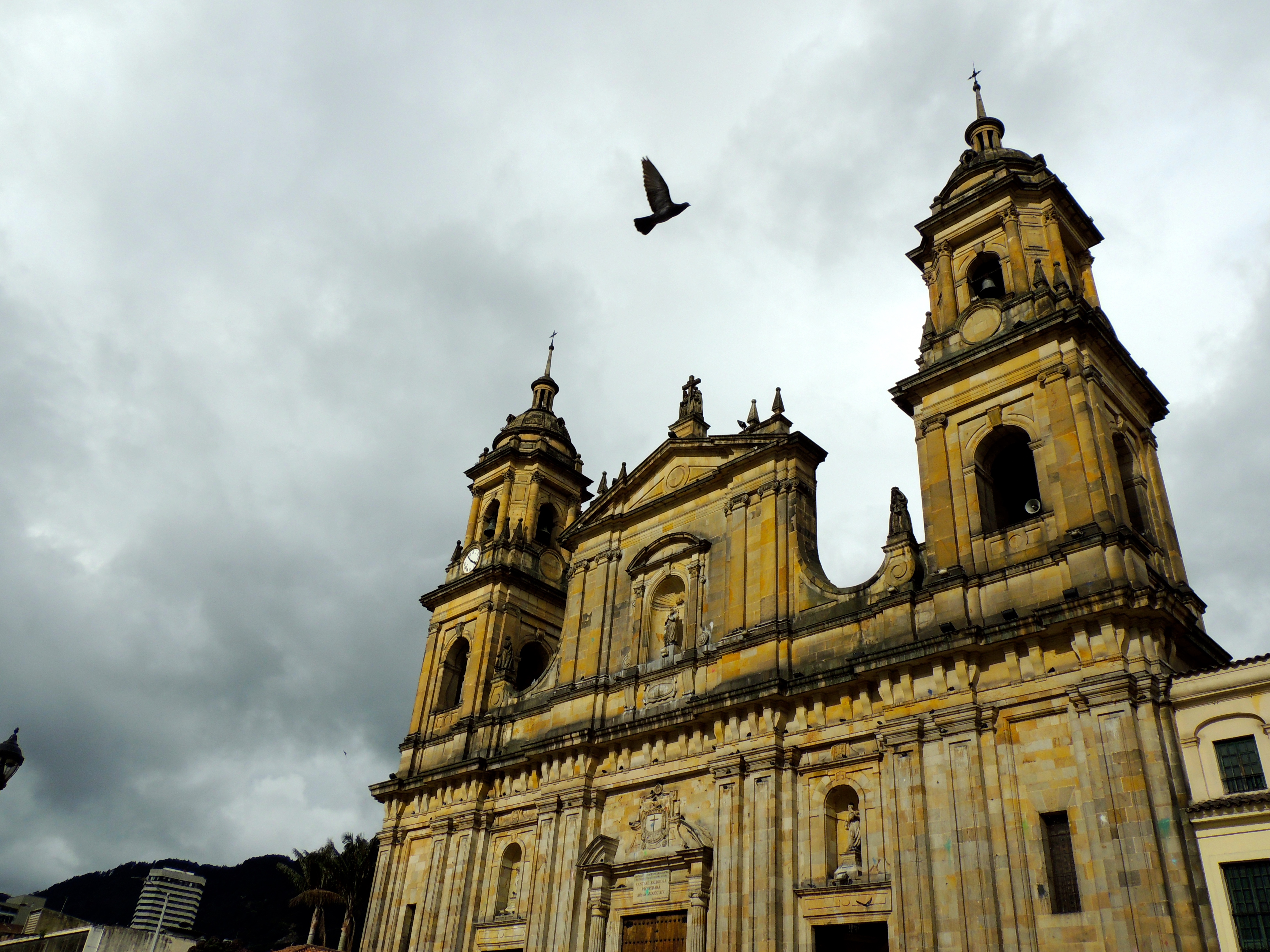 The beautiful Plaza de Bolivar is smack dab in the center of La Candelaria in old town Bogota. People flock here to feed pigeons, ride llamas and hawk their wares.