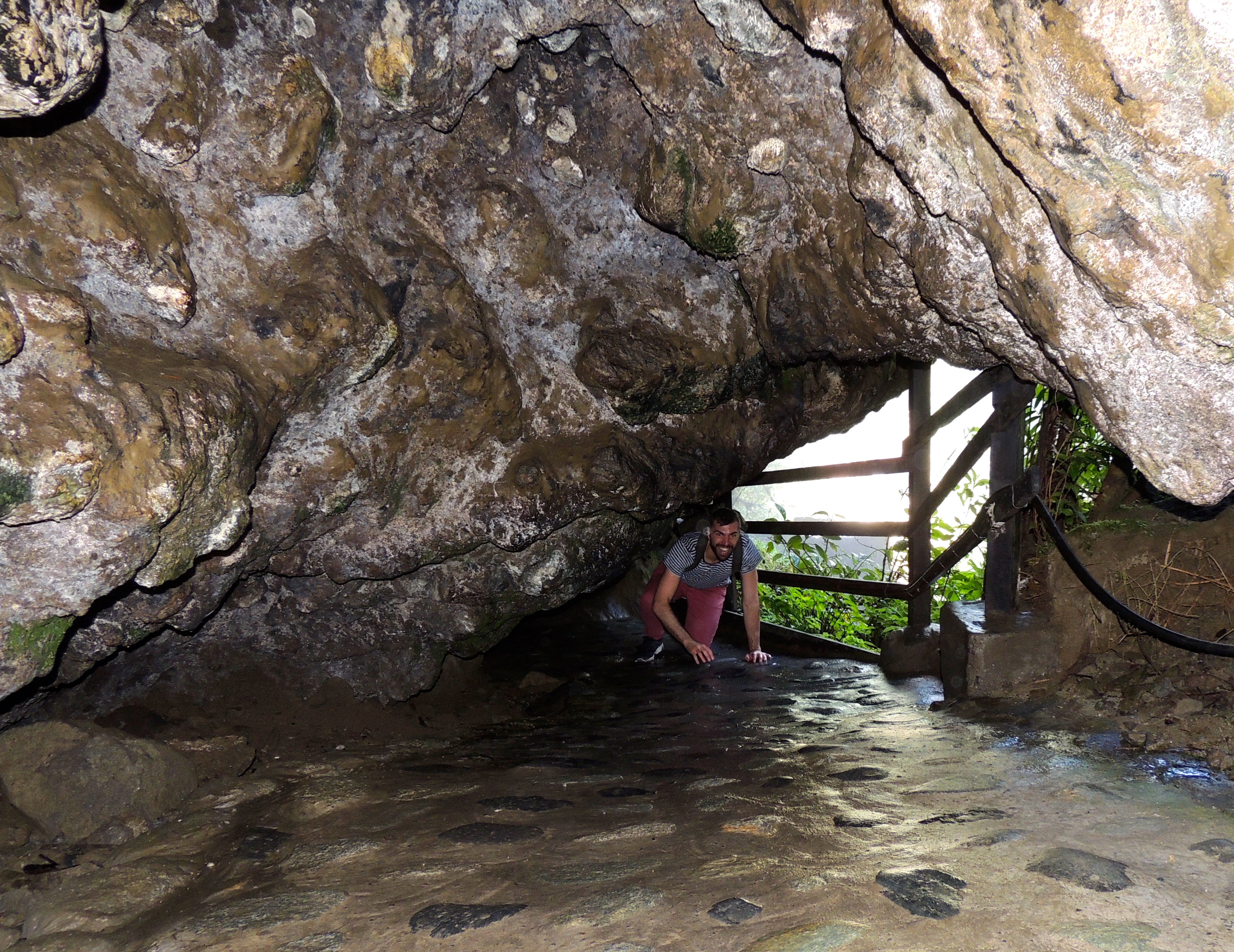 They had created stairs in the mountain side that you could climb up and down for different views – be warned- you will get soaked here! The best part however was yet to come- they had carved into the mountain side little pathways that you had to literally get down on your knees to crawl through tunnels and crevices so you could get closer and closer to the waterfall until you were finally behind it’s raging stream, getting drenched with it’s cold spray.  We laughed and snapped photos trying to protect our cameras from the water by hiding them within our rain coats. If you have even a little claustrophobia, I wouldn’t recommend venturing into the tunnels in the mountain as they are pretty tight and a little scary.
