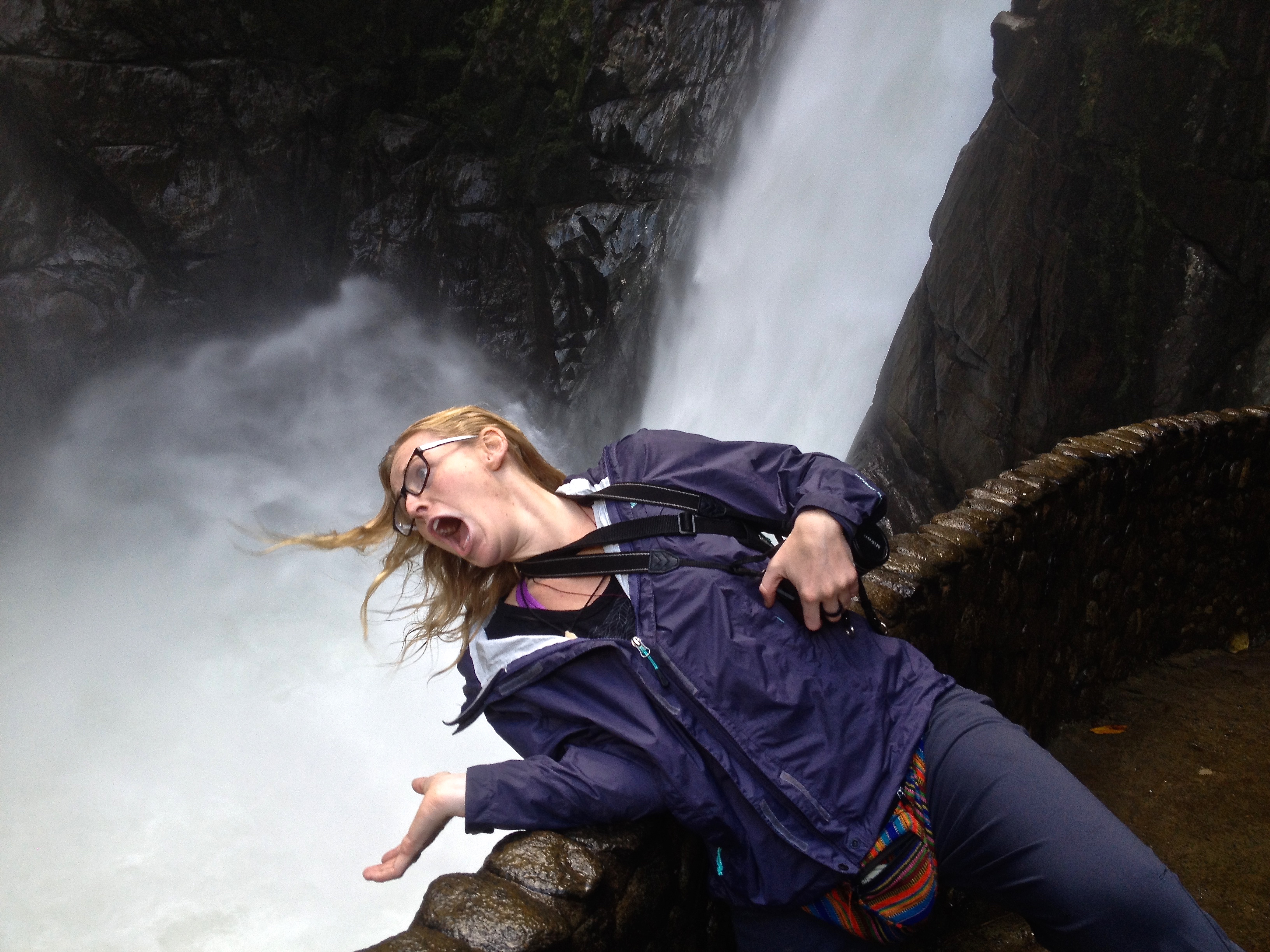 Baños is crazy beautiful. We were still having troubles with our guts but things were slowly improving. We stuck to the soup and added some basic pasta in to our diet to cut the awful monotony of the soup. It was glorious. We made all of our own food, not daring to test our tender stomachs yet by eating out. Oatmeal and fruit for breakfast, soup for lunch and pasta for dinner:  simple. The next day we got a little tour of the city from the hostel owner to see where things were located and decided to book a tour. We signed up for canyoning- something neither of us had ever done. We were picked up in a 4×4 jeep and hit the winding roads, cruising through the mountains for about 45 minutes to get to our spot. We had about a 25 minute climb up the mountainside, which some American girls had warned us was ‘really strenuous’. Sure we were out of breath, this was the most exercise I’d had since Tayrona, but it wasn’t as bad as the girls had made it out to be. We felt proud for getting to the top in our weakened condition and then got geared up for the rest of the adventure which was all downhill- er, down waterfall, from here!