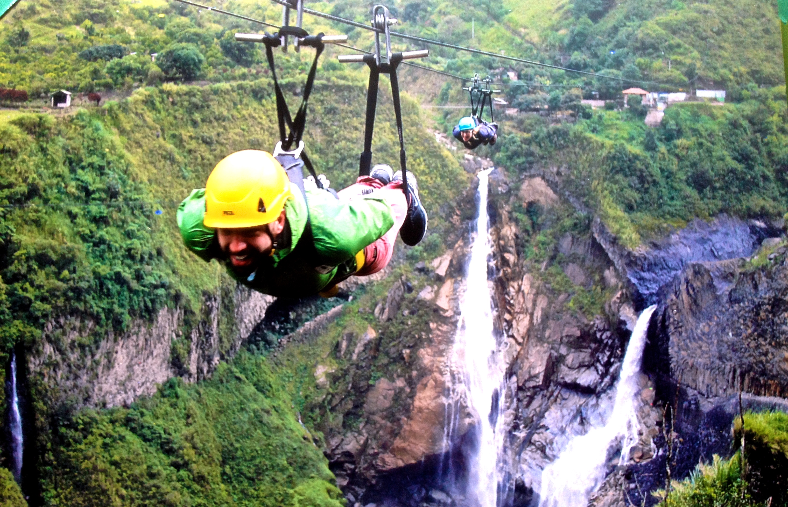 They hooked up our zipline (which was definitely the least safe zipline I’ve ever been on: no secondary or tertiary safety security, they just wrapped some canvas around a t-bar and off the guide went to the other side to accept us!). Anthony asked me if it looked safe and I hid my slight anxiety at the amateur safety of the operation and assured him it looked fine. They attached an Ecuador flag to our feet and sent us off at the same time, screaming across the wide canyon heading straight for a massive waterfall. We landed just above it screaming with exhilaration. I had been zip lining twice before, but this was a really great experience doing it over the canyon and the waterfall. We zipped back on a different line and came screaming in at top speeds looking like we were going to smash headfirst into a huge metal structure, but our guide- laughing hysterically- stopped us just in time. We got unstrapped, shaking slightly and laughing. They had snapped a great picture we could buy for 2$ and didn’t hesitate to after we saw it.