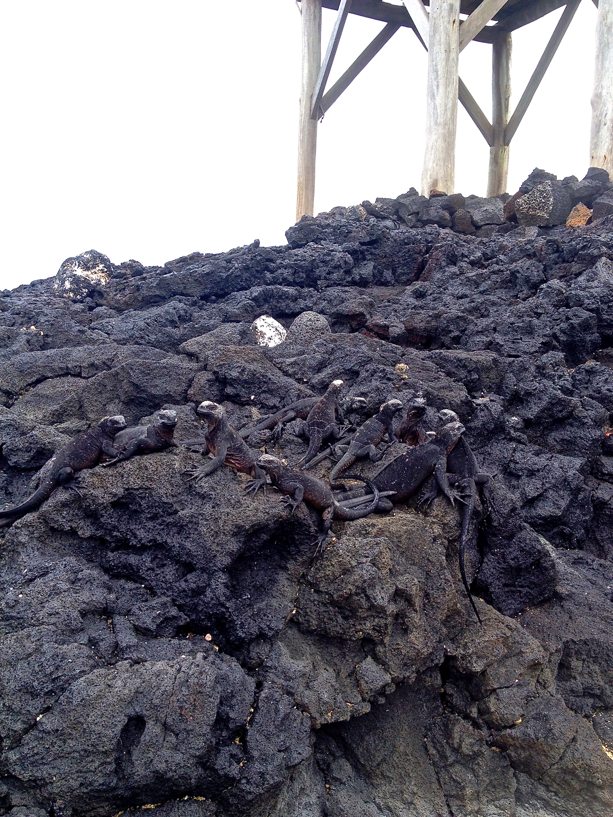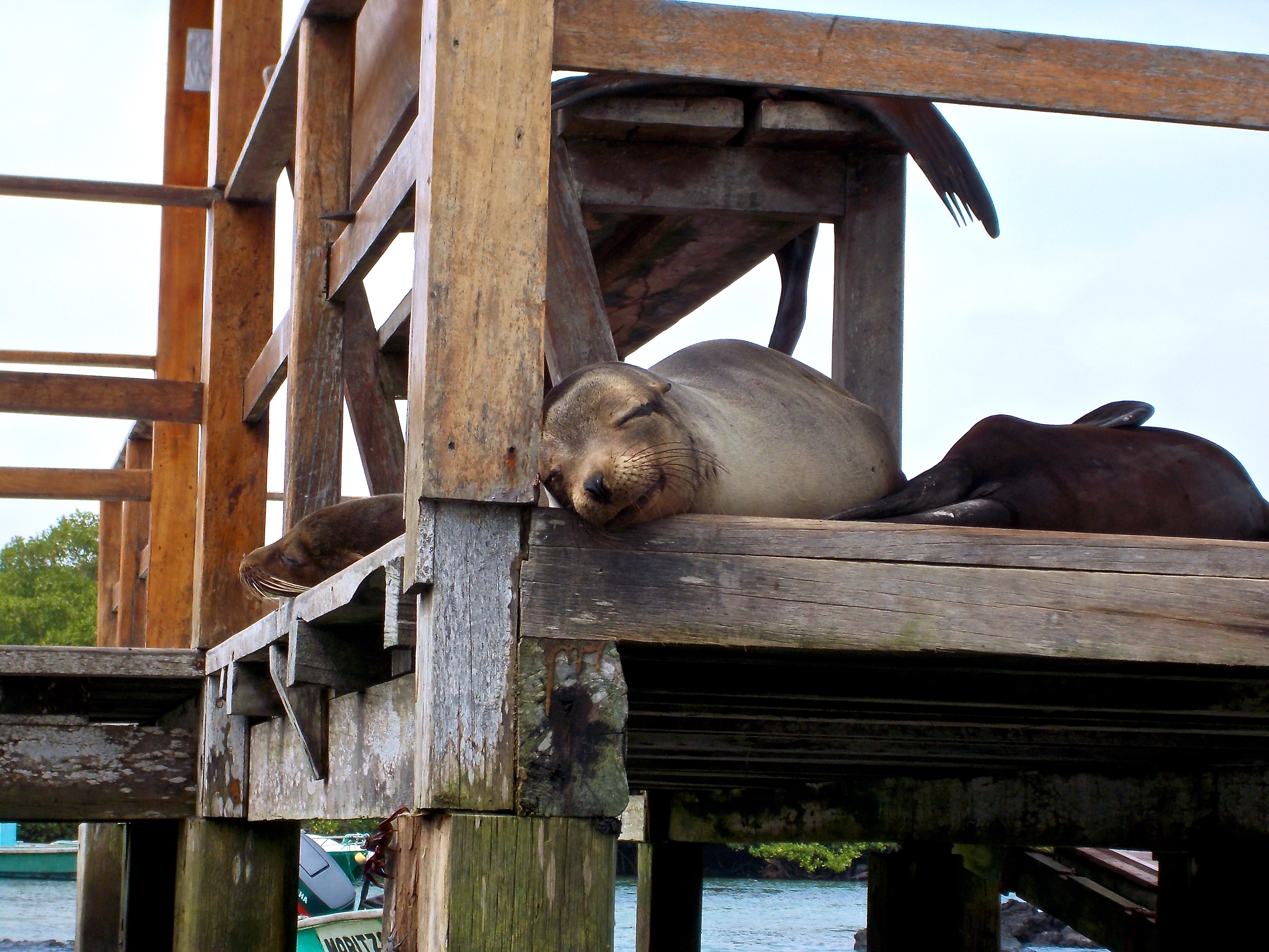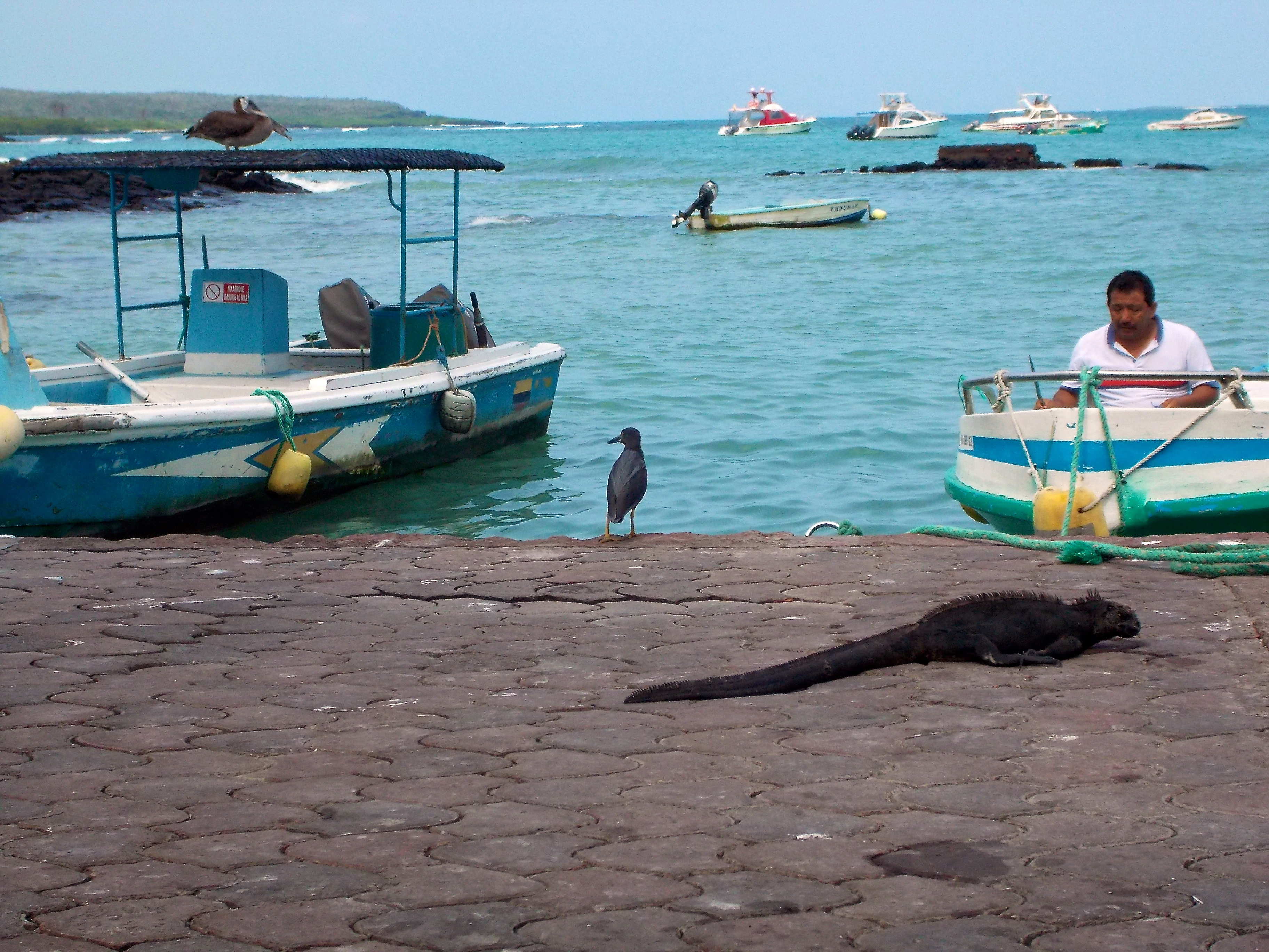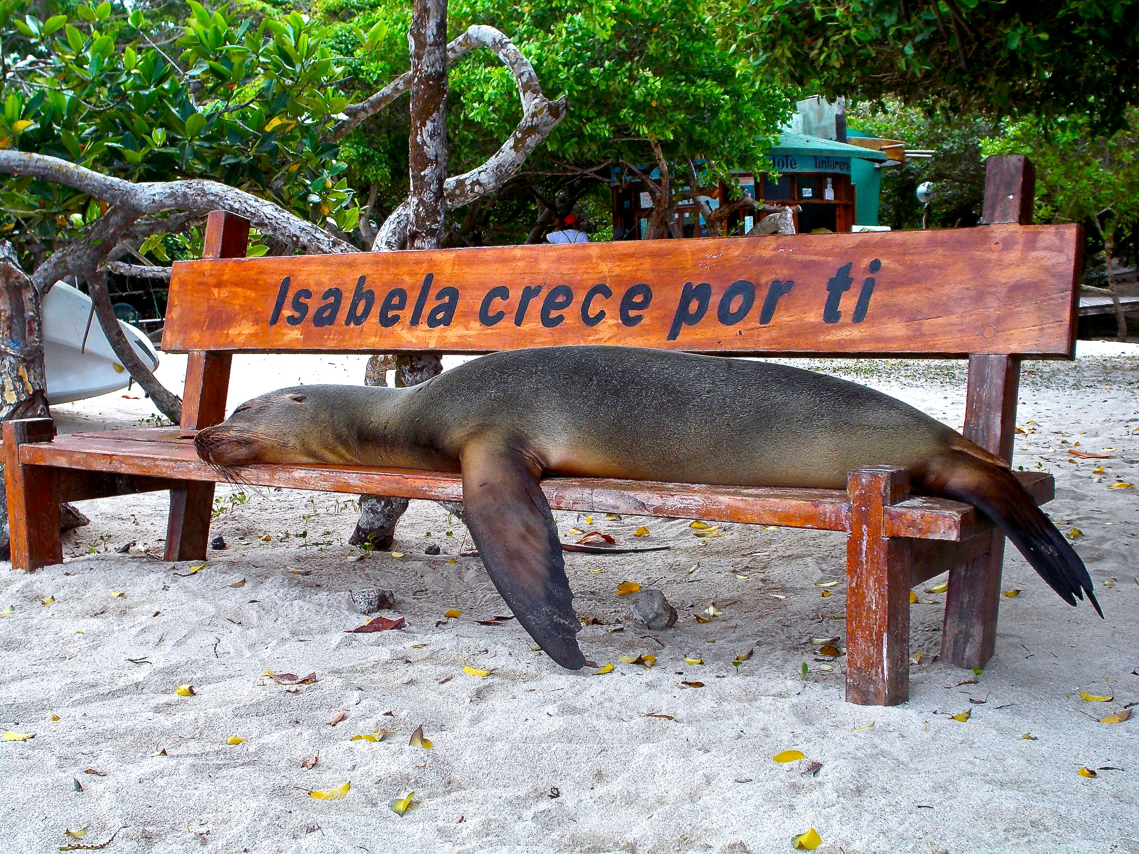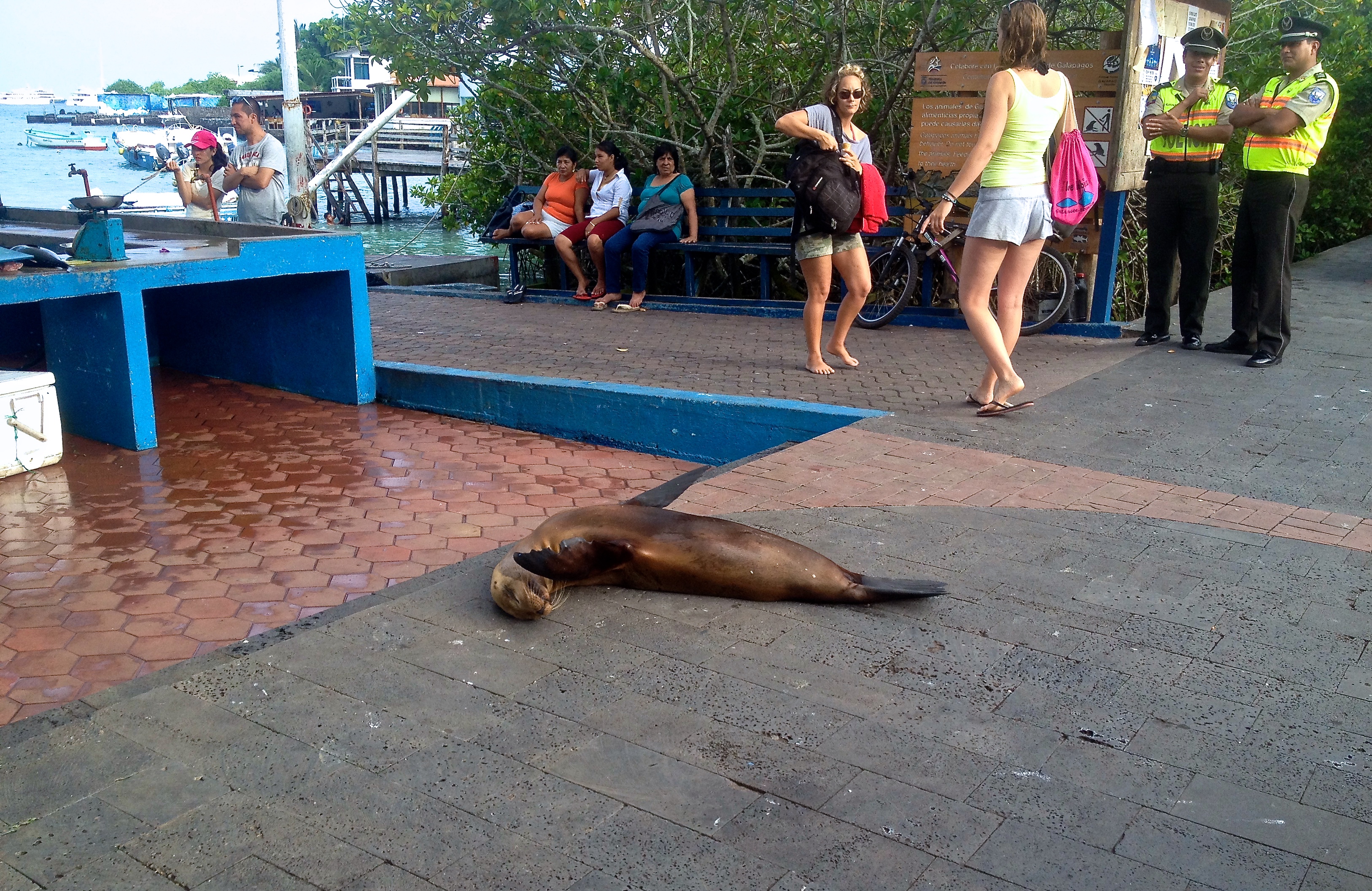 After the tortoises, we decided to head towards the beach and dock to catch some sun. I rented snorkel gear for $5 but there really was nothing at all to see in this spot. I was in the sea, walking back towards the shore and Anthony started gesturing behind me. I looked back and a sea lion was swimming behind me, following me! I was so excited! He swam off when I took notice so I went back out into the water to see if he would come back. I waded over to a rock and saw a marine iguana hop off the rocks right into the water and swim back to shore- yet another strange sight on these wondrous islands. I began to head back to shore and once again a sea lion popped up behind me and slowly followed me. I walked up on to shore and he followed behind me, then waddled right past and flopped himself on to a bench, let out a huge sigh and settled in for the rest of the day. I went back in to cool off and was talking to another traveler in the water, explaining how I didn’t think I’d have a chance to see the penguins as you usually needed a tour to see them on another island, when moments later a little penguin popped up from the water only a few feet away from me and swam off- I was in shock! Ask and you shall receive from the Galapagos!