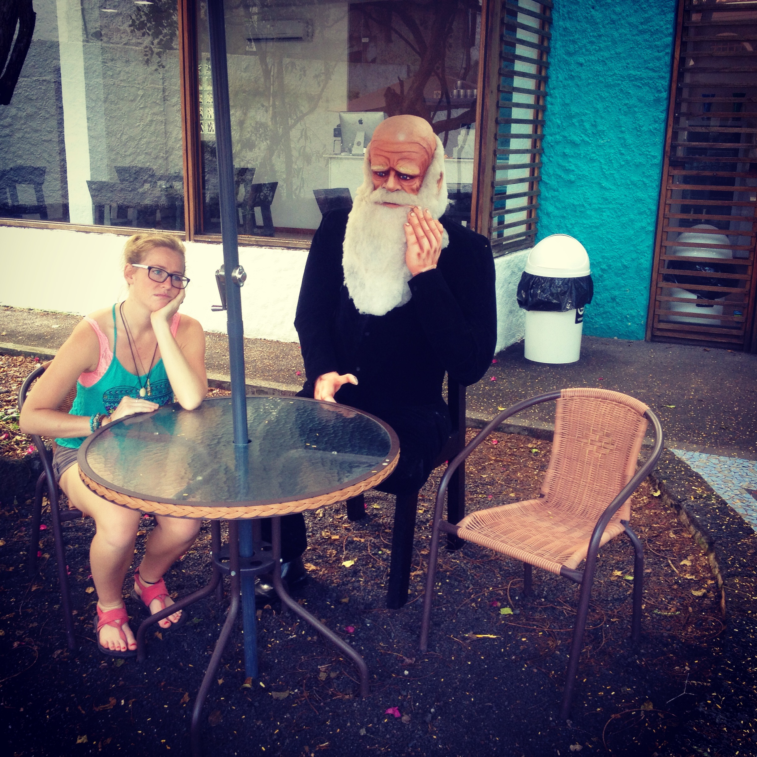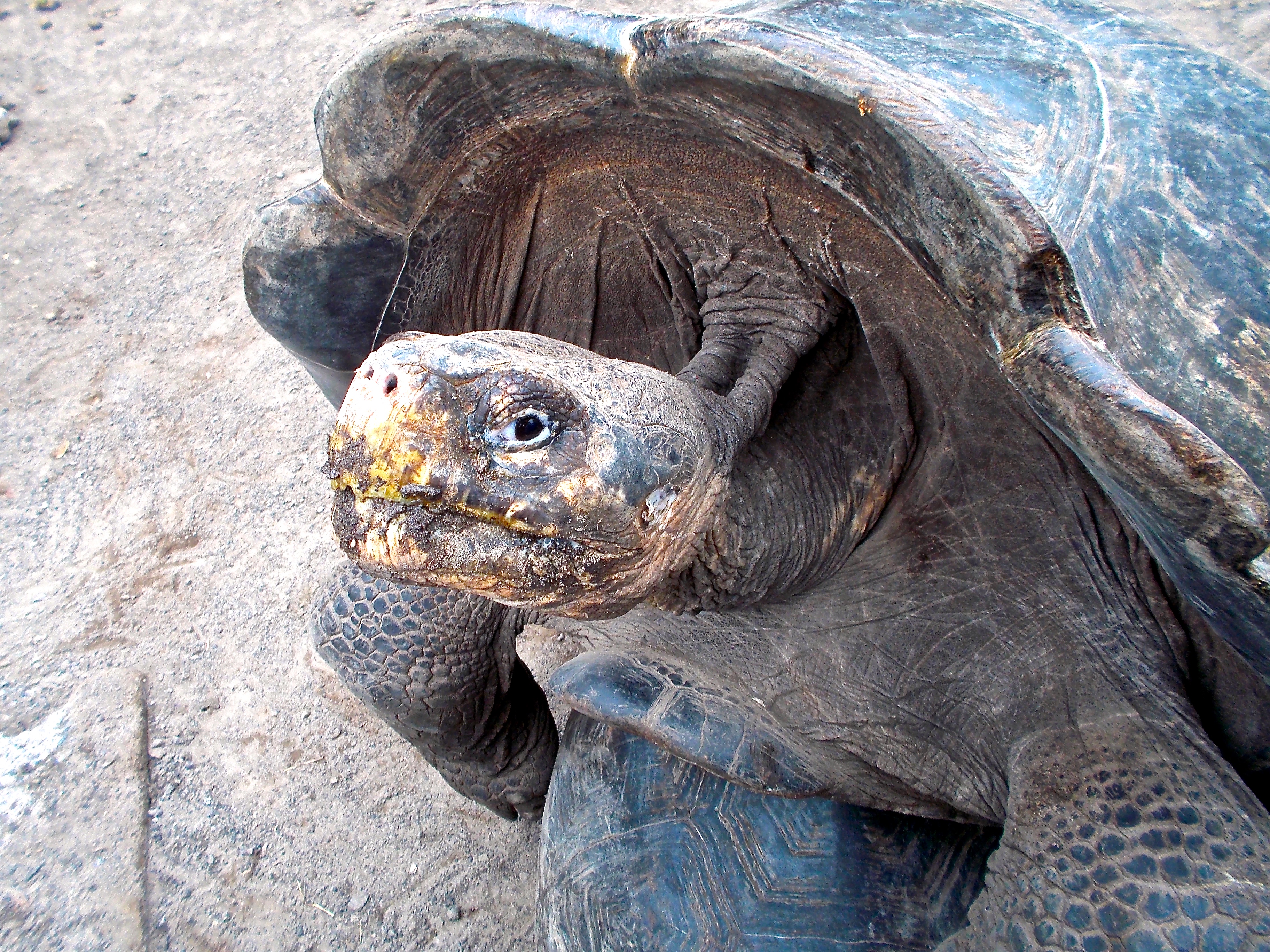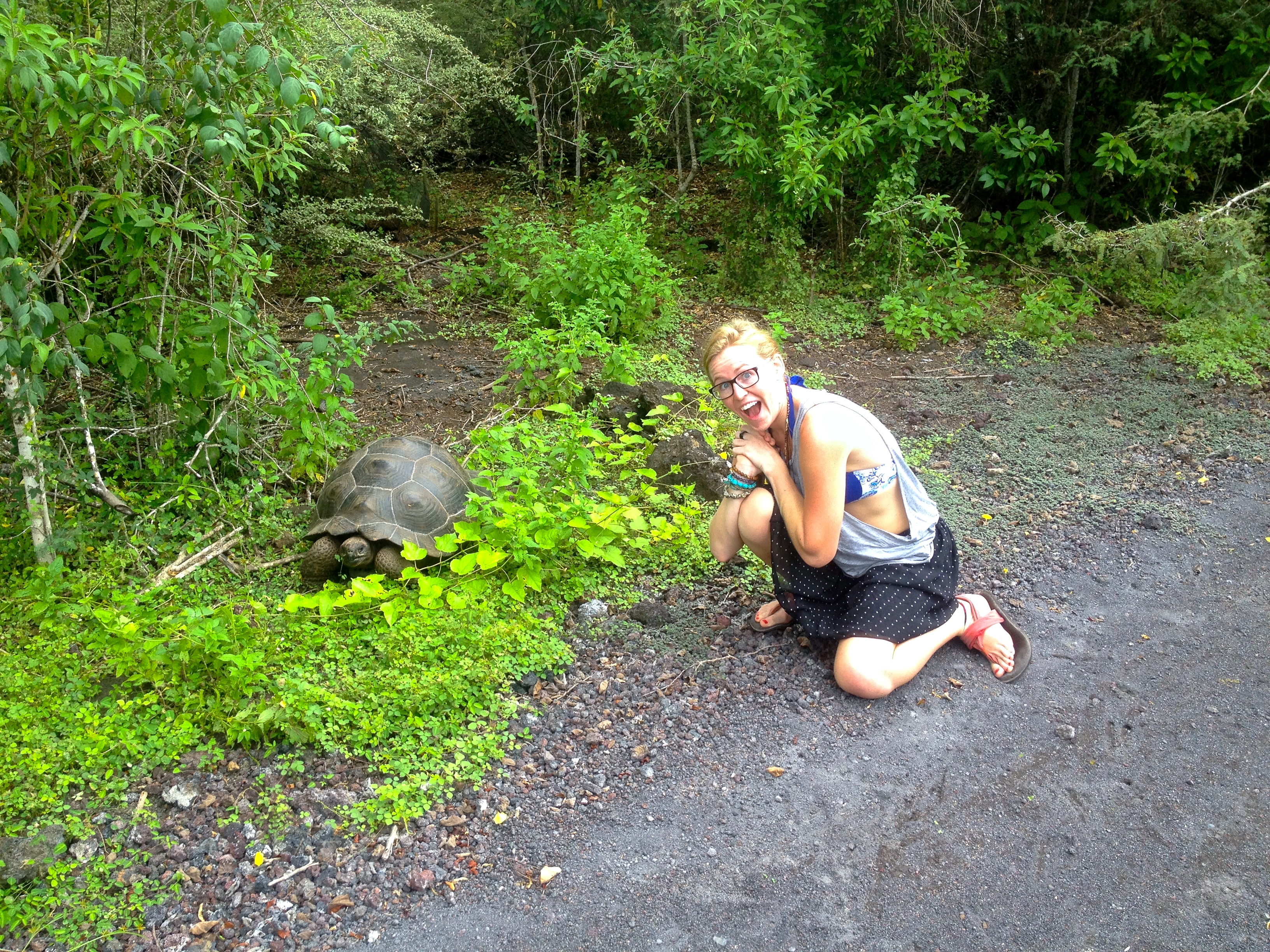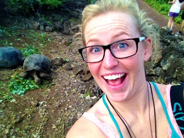 We checked into our hostel and hit the town to wander around. We had decided to do the Galapagos only because we figured we could do it for far cheaper than it cost most people by not doing any organized tours and just doing the islands ourselves. We researched and found out there were loads of free things to do so we set out to find them. We walked around the cute little town and then made our way towards the Darwin research centre and tortoise breeding grounds, about a half hour walk. On the way we passed by a wharf area where local women were cutting up fish, and sea lions were lounging on the sidewalks. I was ecstatic! A sea lion on the sidewalk! Like all the rest, I pulled out my little camera and snapped a bunch of photos, including the obligatory sealion selfie! On we walked in search of the tortoises and Darwin things. We found giant statues on the way- both a tortoise and a Darwin!