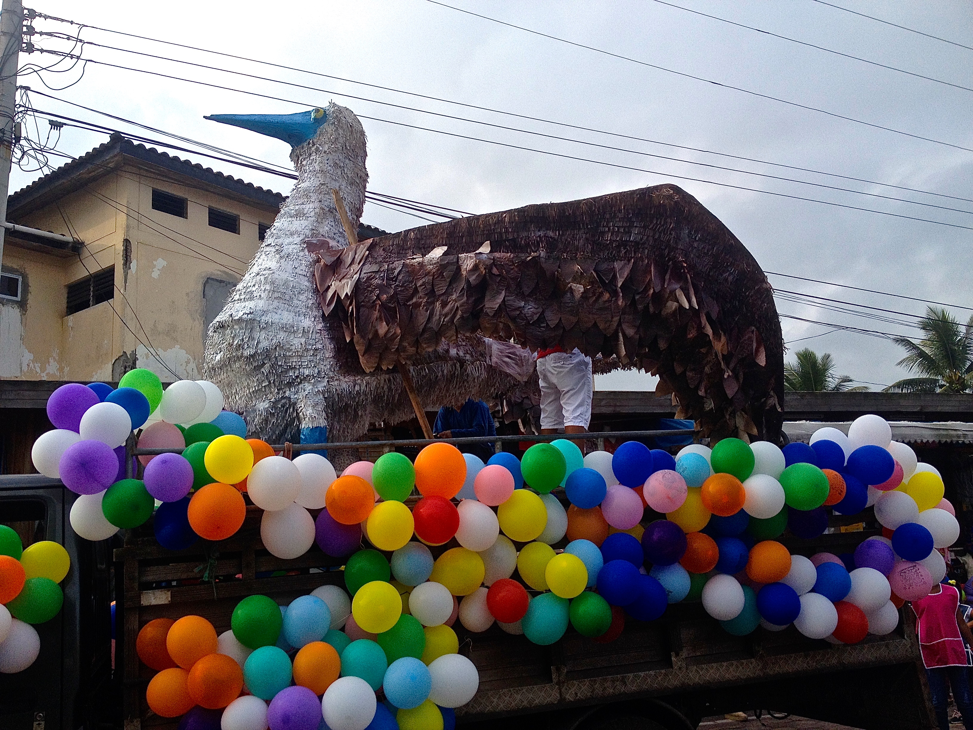 We wandered through the Darwin Research centre and read up on information about the islands, their history and present endangerment, and saw all of the research buildings where the scientists conducted their research. We followed a small path and found two small beaches that the locals used and even saw a local catching a few waves on his surf board. We caught our first glimpse of the strange black marine iguanas as they sun bathed themselves on the camouflaged rocks. Bright red crabs skittered about wildly as waves came crashing in over the rocks. This place was growing on us fast with its peculiar wildlife and landscapes. We wandered slowly back to the main town square and came upon a local parade- the whole town was out and all of the children were dressed in different outfits, (painters, musicians, dancers etc.) and trucks blasted music for them to march to along with the floats. It never seemed to fail that Anthony and I end up finding ourselves in the middle of a parade in whatever town we visit!