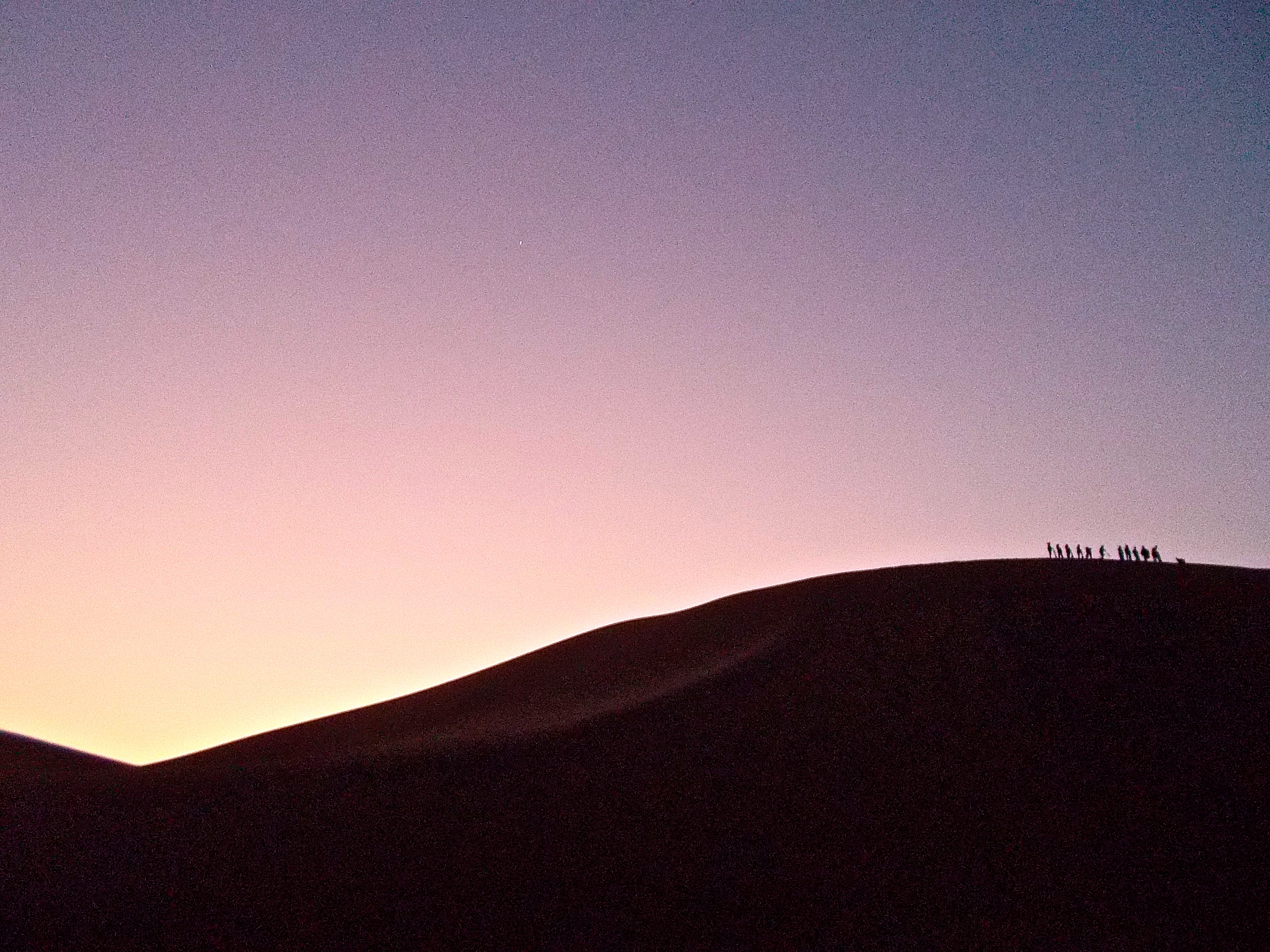 My anxiety was creeping up, and I had a hard time putting it to rest. It looked fun, but from up here it was awful scary and steep. After half the group went I finally just swallowed my fears, got on my tummy and flew down the hill after watching everyone and trying to learn from their mistakes. I flew down at top speed trying my best not to drag my feet as our driver advised us not to do, to slow me down. What a RUSH! I screamed back up at Sally to come down, that it wasn’t nearly as scary as it seemed and she followed suit, screaming the whole way as I did. We moved on to the last hill which was the steepest and longest of them all. Even though we had a little practice, this one still seemed too daunting and no one wanted to be the first. Sally demanded that we simply went in order of the line we were standing in as we straddled the ridge. I was 3rd in line and was actually happy to get it over with. I went as fast as I could, screaming in exhilaration the whole way. What a blast!!! We were finishing up our sand boarding just as the stars were appearing in the purple twilight sky. We all piled back into the buggy and went for a night time cruise through the dunes (okay our driver seemed slightly lost, but we will just call it a detour) and headed back into town as night descended.