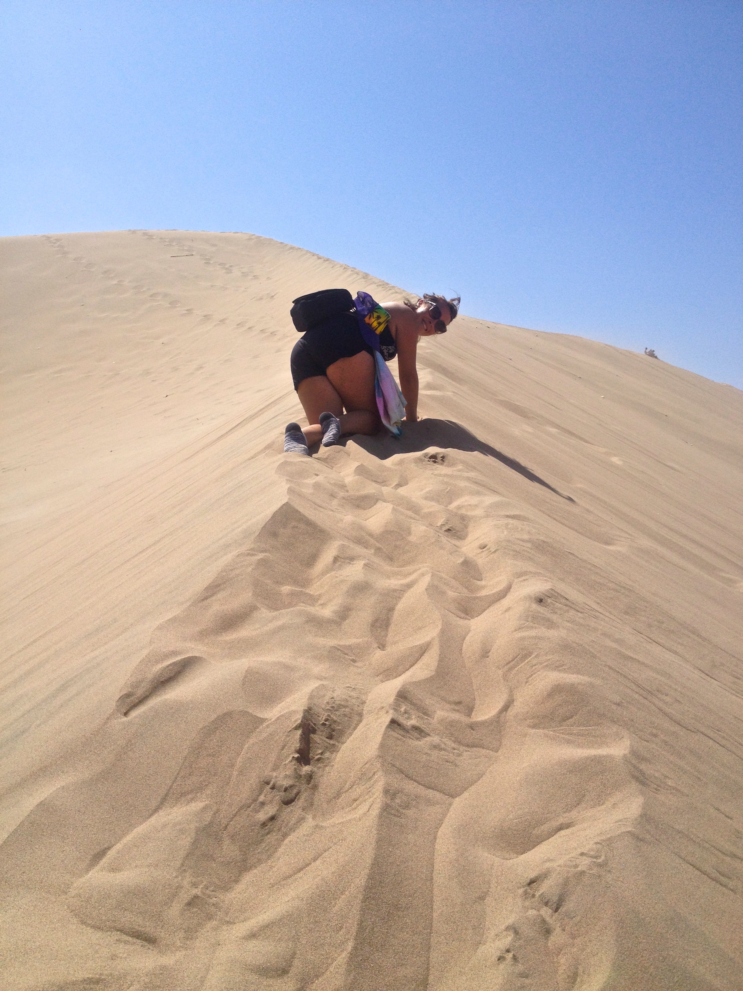 Half way down we decided to stop and play our theme song of our time together thus far: “Cant Feel My Face With You”. We decided a music video would best document our time on the dunes and so set up her phone on her purse, placed my phone next to it blasting the song and hit record. What ensued is surely one of the greatest videos ever made. If it were on youtube it would go viral, I have no doubts. Perhaps 90% of the views would be Sally and I, but who’s keeping count? We howled with laughter as Sally tackled me mid video and sent us tumbling down the sandy hillside. We blew the sand as best we could from our phones, tucked them away and continued running/falling down to the bottom.