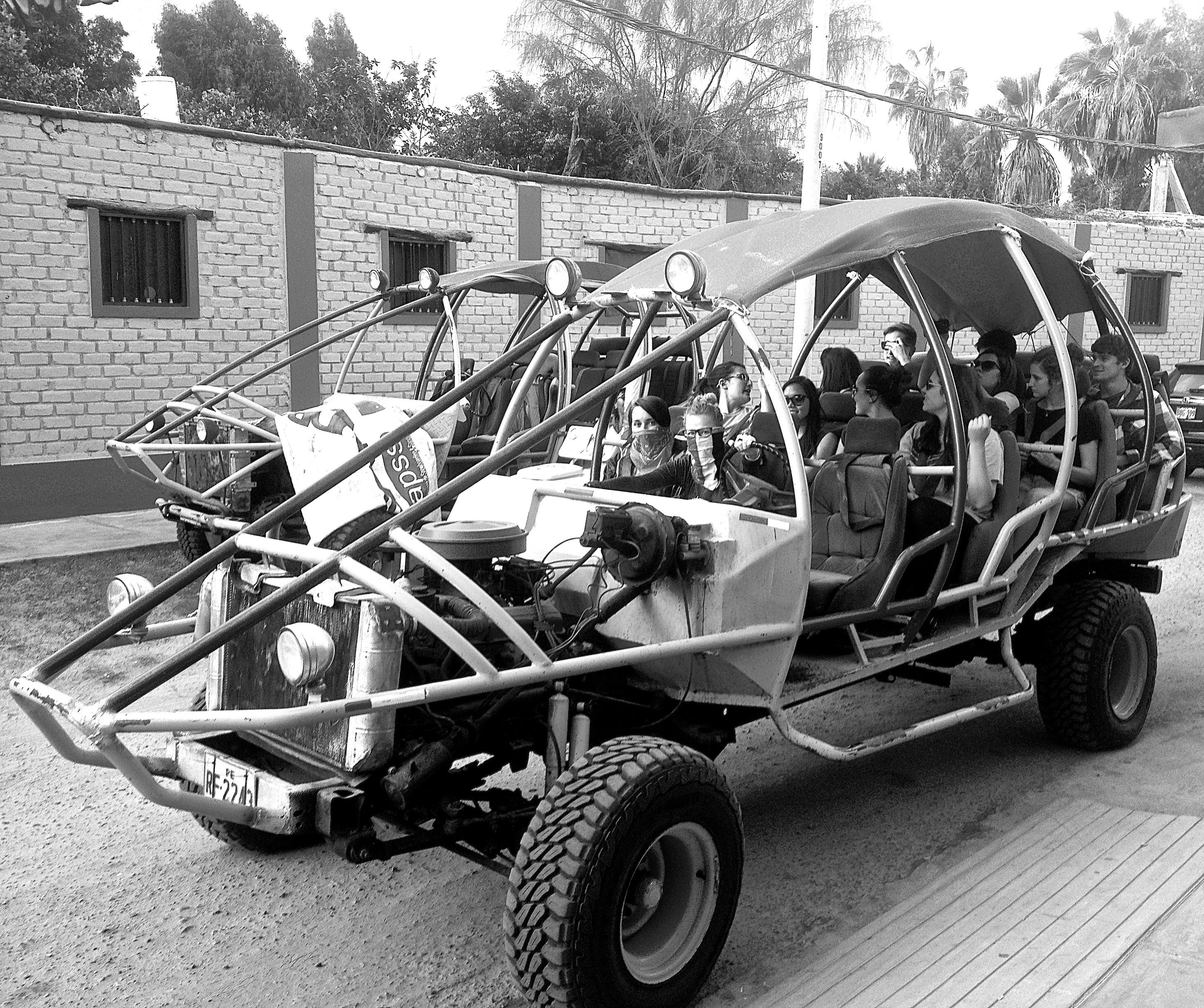 After dinner we ended up going to bed pretty early, woke up the next morning and had breakfast at the hostel – Shakshuka -the best Israeli breakfast – making up for last nights lacklustre ceviche. We packed our bags, and made our way to the bus station to catch our bus to Huacachina, a cheap $7 ride a few hours East. This drive improved only slightly, and I think it was mostly due to the occasional appearance of the sun, adding a touch of colour to the drab world around us. We passed some vineyards, some alive, some at the end of their cycle, and could see mountains off in the far distance. As we crept closer to our destination, the desert expanded and grew like something alive- huge sand dunes exploded out of the ground and filled our vision. Finally, a break from the monotony of bareness. We began to get excited to reach our little desert oasis at last. We got dropped off in Ica and hailed a cab in the bus station who stuffed us into his tiny Yaris. We used our broken Spanish to explain what we were planning- two days in Huacachina and then heading to Cusco. He told us about a great bus line with good prices and said he could stop along the way to buy our tickets- perfect! We got our tickets for a great price to catch a night bus in two days time and then took the 10 minute drive out to Huacachina.