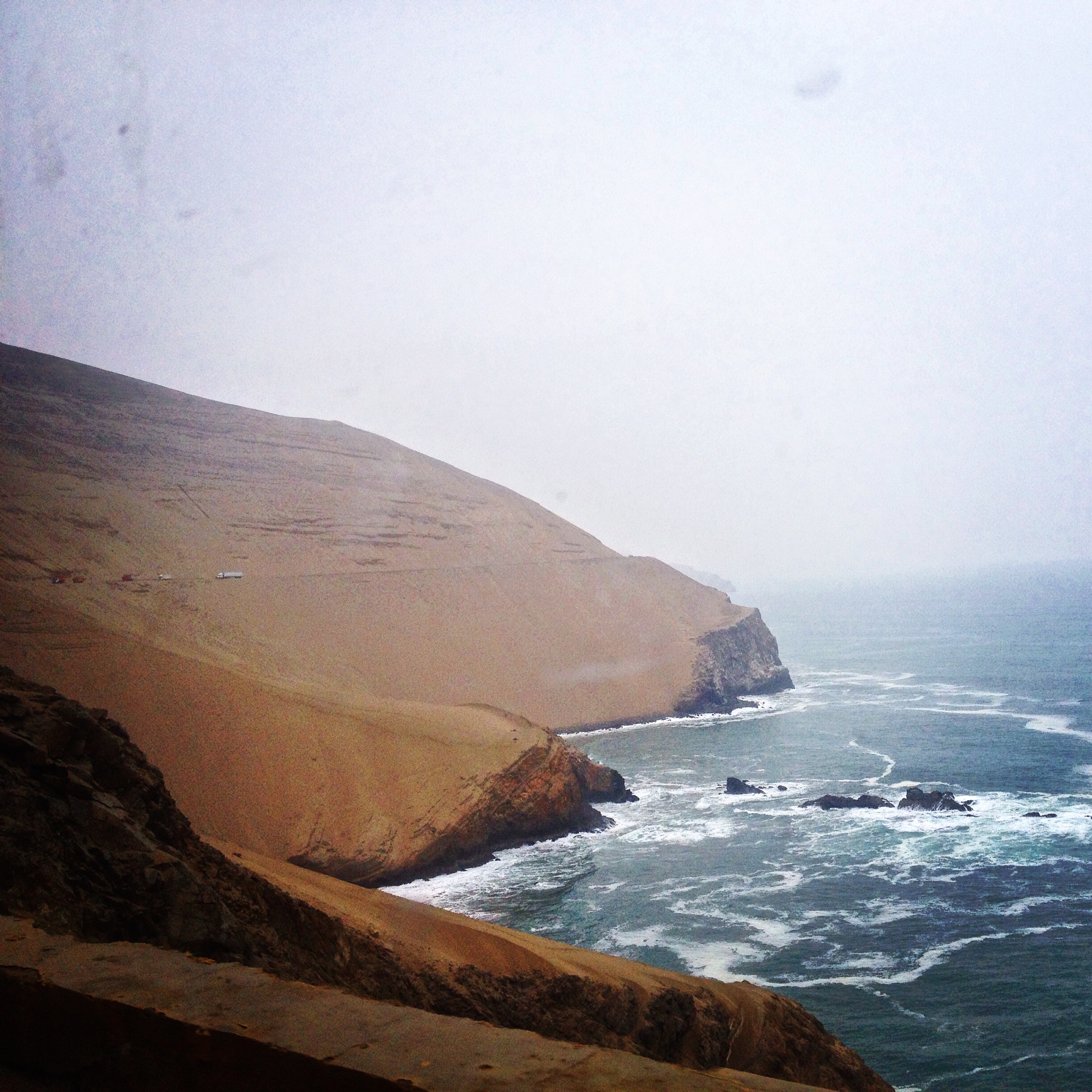 I couldn’t help but feel like I was on some other planet, the forlorn Peruvian landscape was so alien. The grey colour was only interrupted by the rusty rocks and hills. The sky was grey, the sand looked grey, the flatlands were grey; only those strange maroon slopes penetrated the sea of grey. The occasional wooden building leaning perilously to the side, surely pushed over by years of relentless wind, would appear, a lonesome sentinel in an expanse of nothingness. Did someone live here? How could they possibly live here? I couldn’t stop myself from thinking that Peru was ugly. It sounds terrible to say, but Sally confirmed my thoughts when she spoke them aloud in her audacious Australian accent- “Peru is so ugly!!!” I laughed and said I had just been thinking the same. The cold desolation of the last several hours of the drive had left us mostly in silence, the appearance of the landscape penetrating into us and leaving us without words to describe what we were seeing. We were both surprised and had no idea that this is what Peru looked like. From Mancora all the way down to Lima, nearly 20 hours and 1100km, and this was all we saw mile after mile after mile.