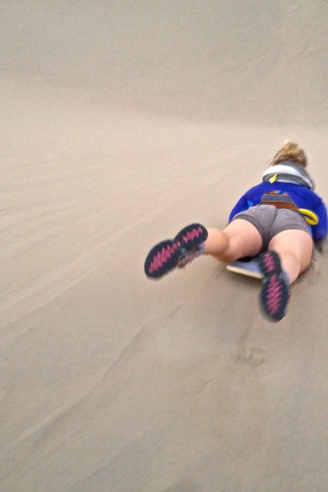 After cruising around the dunes, we parked for a spectacular sunset and some photo opportunities. We wrapped ourselves up as the sun set and briskly took the warmth of the day with it. We huddled together on the sand and watched that big ball of fire sink away behind the dunes. Now it was time to try our hands at boarding, before darkness took us all. I strapped one foot into the board on a baby hill to see what it would be like to snowboard down and actually made it down 20 feet before toppling onto my behind at the bottom. It was fun, but scary and I made the smart decision to ride down on my ass instead as everyone else did. The first hill was a smaller hill- a tester, meaning it was only slightly scary. We moved quickly to the next hill- a beast in comparison to the last one.