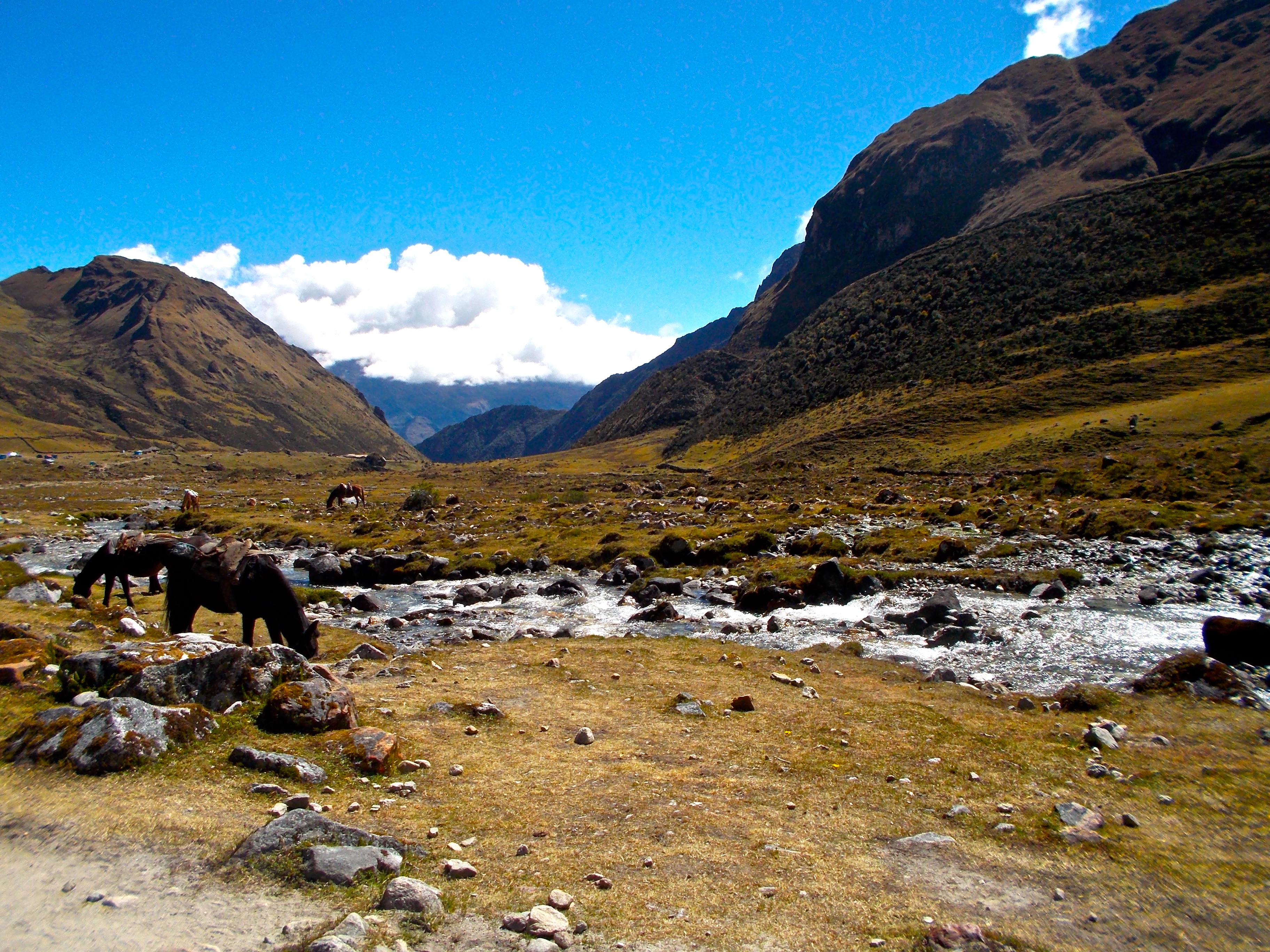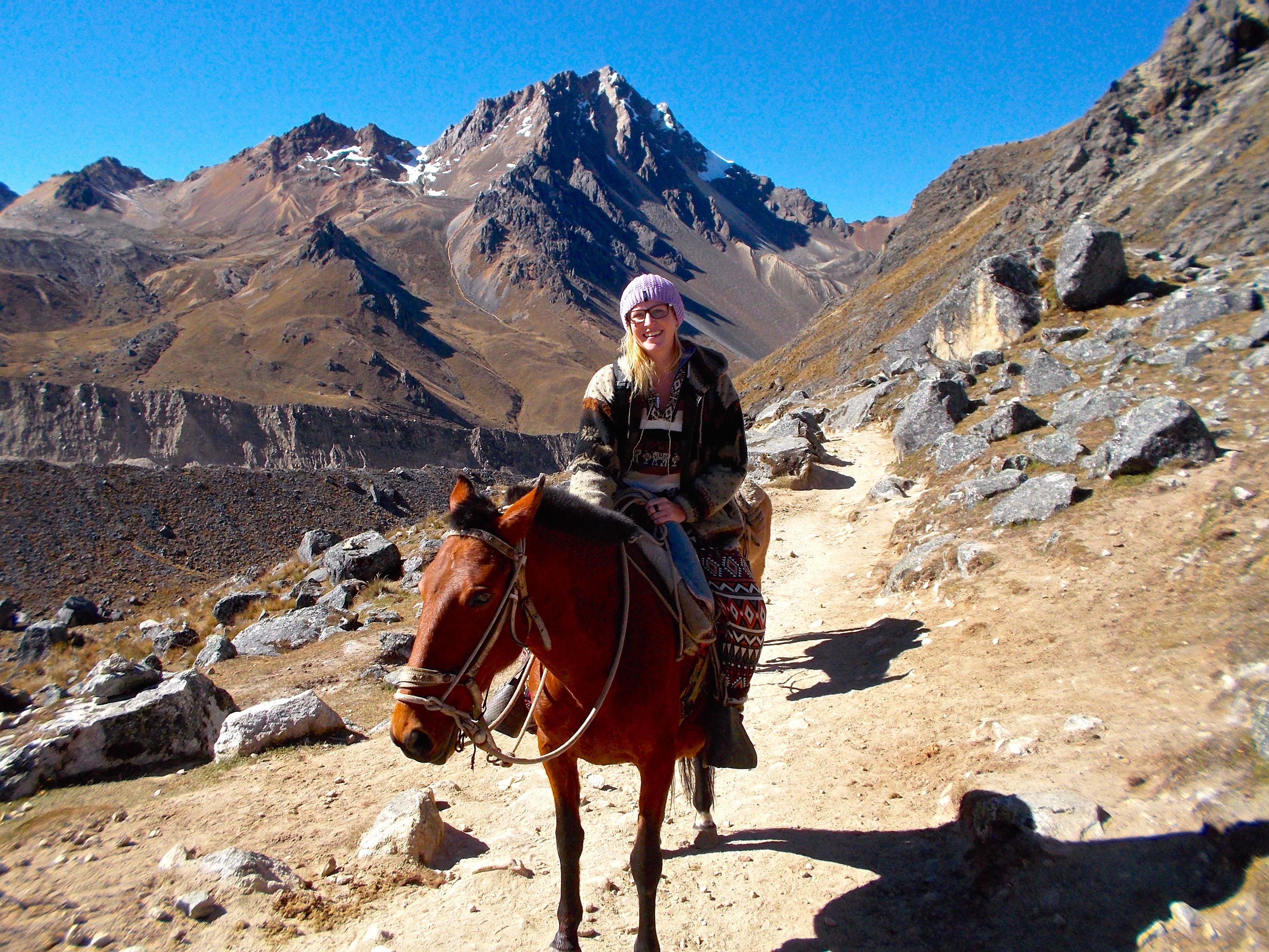 After a couple of hours the sun finally crested the staggering mountain sides that we were nestled between. The four hours cruised by and soon it was time to decide if we wanted to take our horses the last little way up. Thus far we had powered through. Sally and Eve were excited to get on the horses and ready for it. I wanted to keep going on foot, and knew I could finish no problem on foot, but I had paid a pretty penny for that horse. But more than anything… I had never ridden a horse in my whole life before (okay, 7 years old with a cowboy in the Dominican Republic doesn’t really count). I had a chance to ride a horse (okay, it was a mule, close enough!) for my first time, through some of the most majestic mountain scenery in Peru on my way to Machu Picchu- how freaking cool is that?! I had to come to terms with my decision; I had to believe in myself and know that I wasn’t taking the horse because I felt tired and defeated and could no longer walk (where the hell as that damn horse yesterday?! I would have paid ten times what I did then!), but because I had already paid and I could get the exceptionally unique experience of my first horse ride being in this beautiful place. I felt happy with my decision and the three of us mounted up and began to canter uphill.