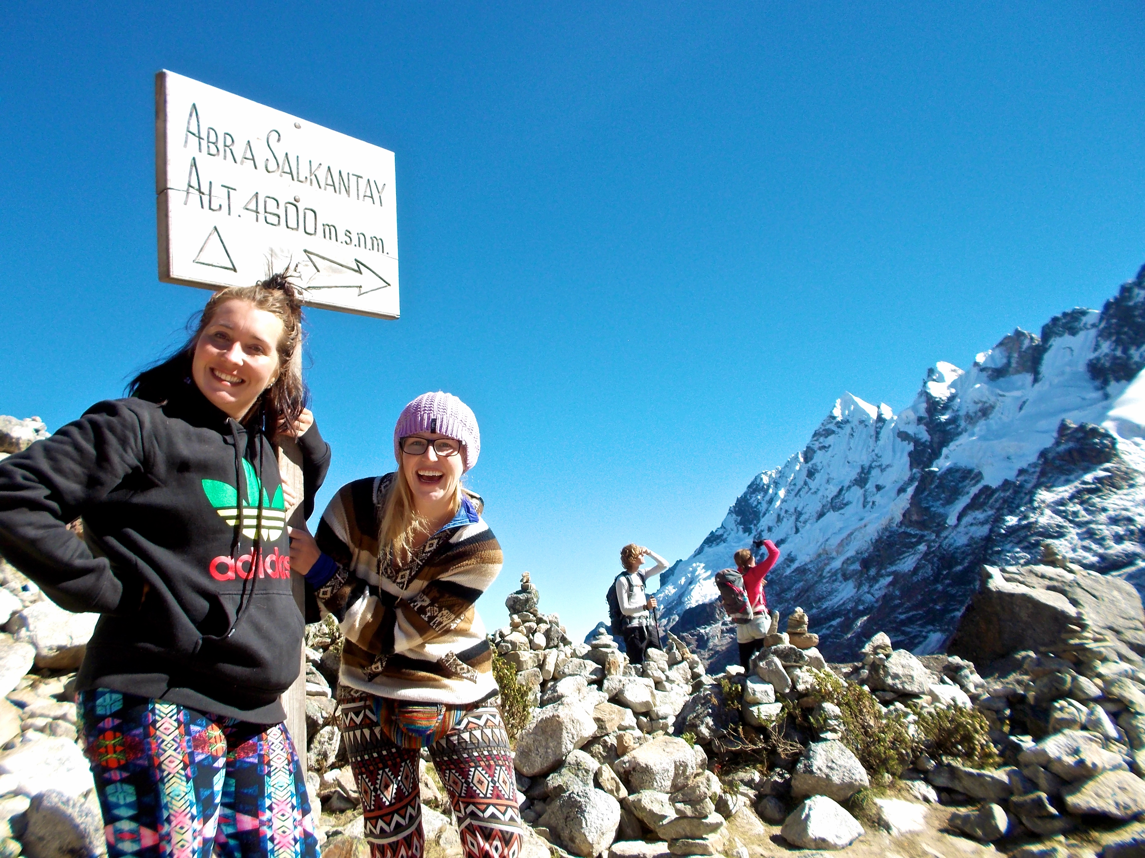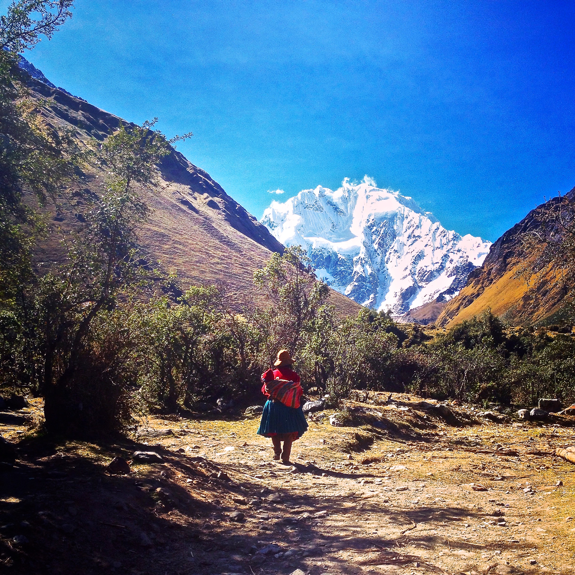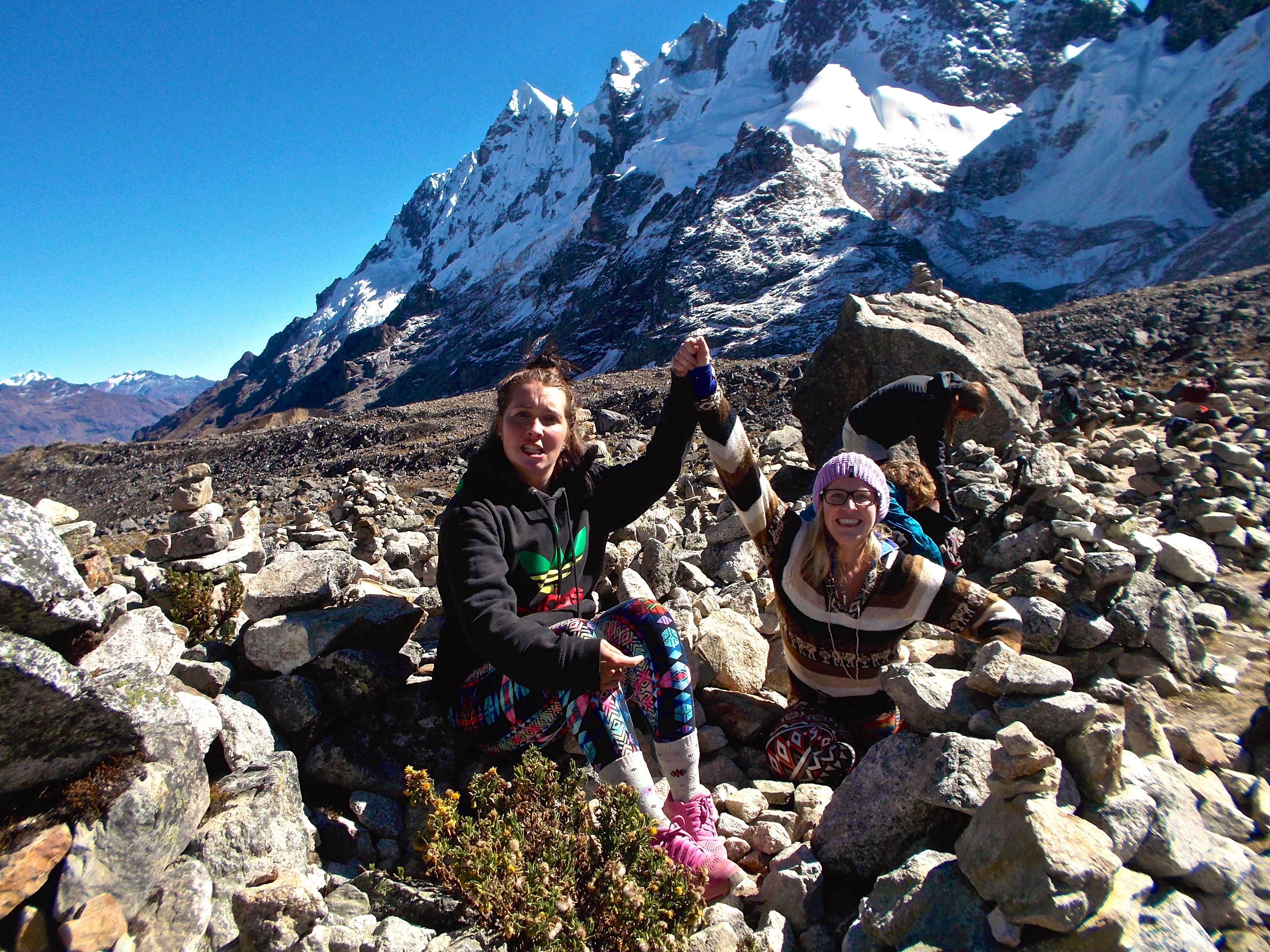 I climbed about seven stairs worth of an incline and when I reached the top I simply couldn’t stand and I fell over, my body aching for the earth, to feel her on every inch of me. Her warm dirt welcomed me like the sweet hand of death, coaxing me to lay down completely, to just surrender. A small Peruvian woman getting on in age, carrying a small child in the hood of her shawl came behind me on the incline, without a hitch in her breath, and saw me topple over. She looked at me with concern (or perhaps it was pity) and simply said “No!” Meaning, don’t give up, don’t sit down here, keep going. The only Spanish word I could bring to my foggy brain was ‘cerca?” (“near”). She understood and affirmed that yes, I was close. Sally came stumbling up the incline after her and I forced myself to get up. We both rolled into base camp five minutes later and I was sure I was dreaming. I have never ever been so happy to sit down in my life. The nausea, the swimming head, the thick, no longer dull, but pronounced throb in my head, the shooting pains through every fibre of my being – every warning sign in my body was screaming off violent warning calls to stop, stop, stop! retreat! surrender!