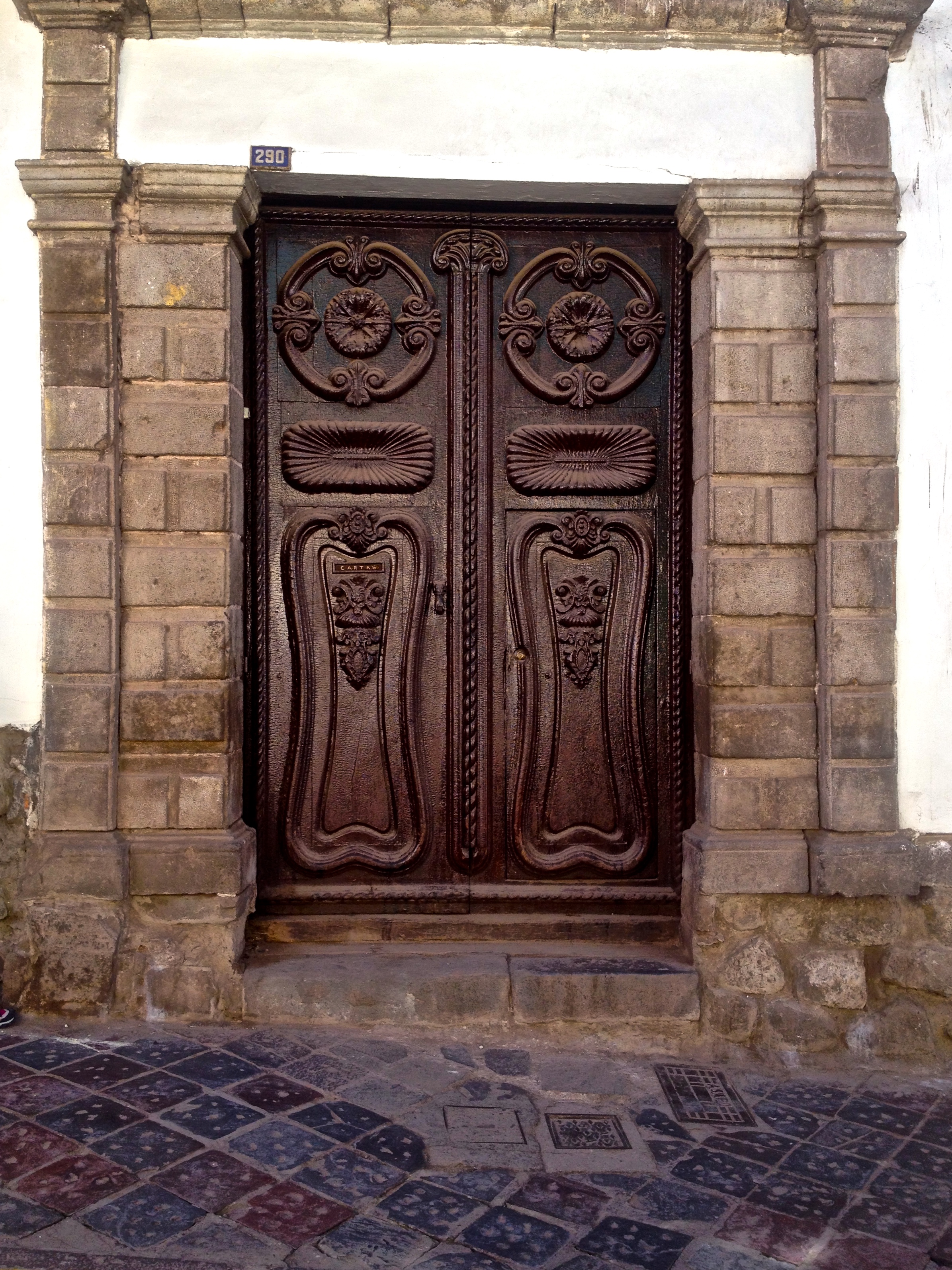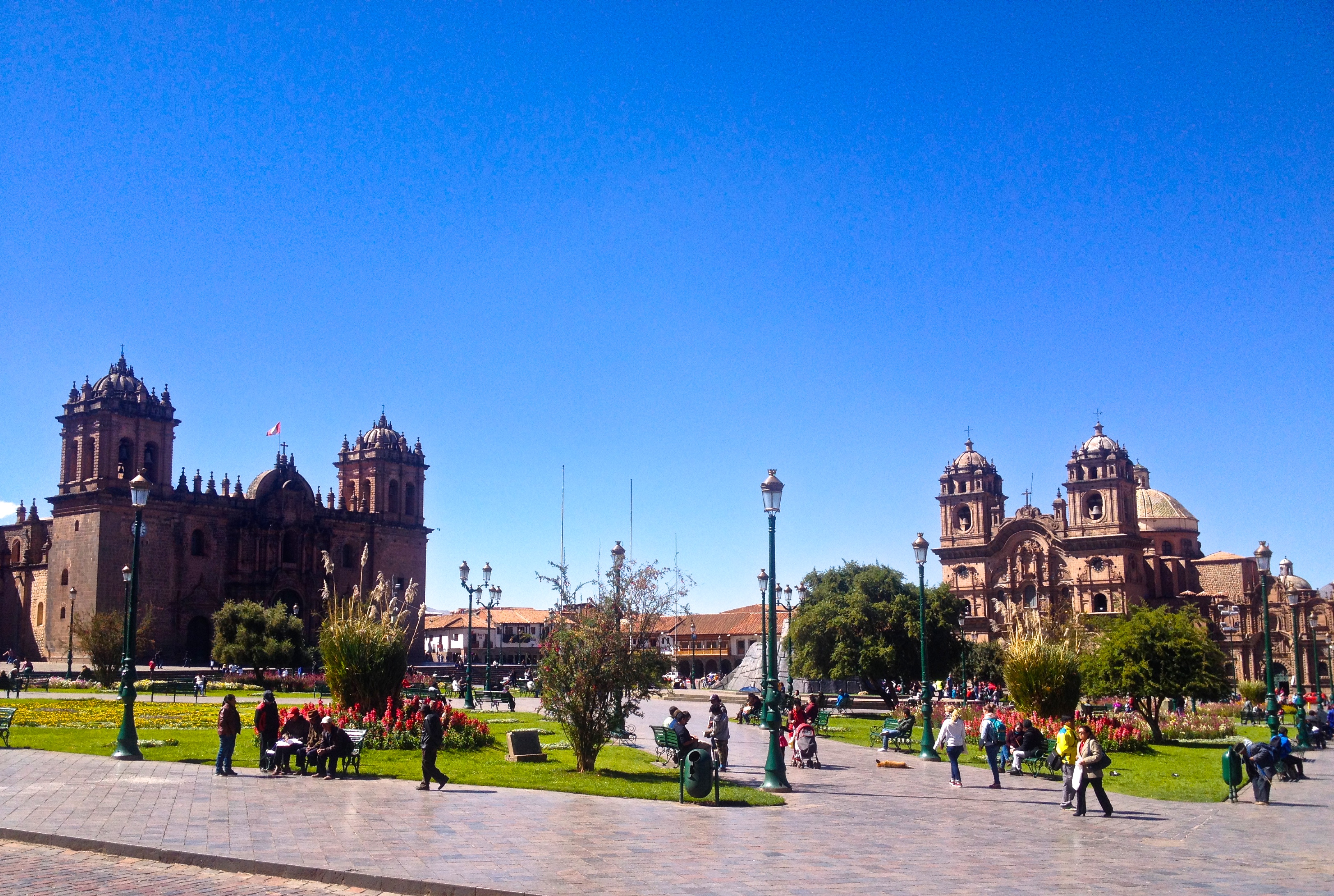 We decided to hit the town. Who needs sleep right? Cusco. WOW. I Love you! What a vibrant and vigorous city, full of energy, colour and noise! On the drive in, I saw the more abrasive side of the city – huge piles of garbage 40 feet wide dumped on the side of the road, wild dogs wandering in packs, and streets and buildings covered in filth. Where we were staying – the heart of Cusco – was the tourist center; the buildings were old and Baroque from the Spanish conquest. Colourful doors dotted the ancient brick walls. Cobblestone streets left your teeth chattering after you got out of your cab. The sun peered through clouds to beat down on the throngs of people milling about the streets. It was clean and full of character.