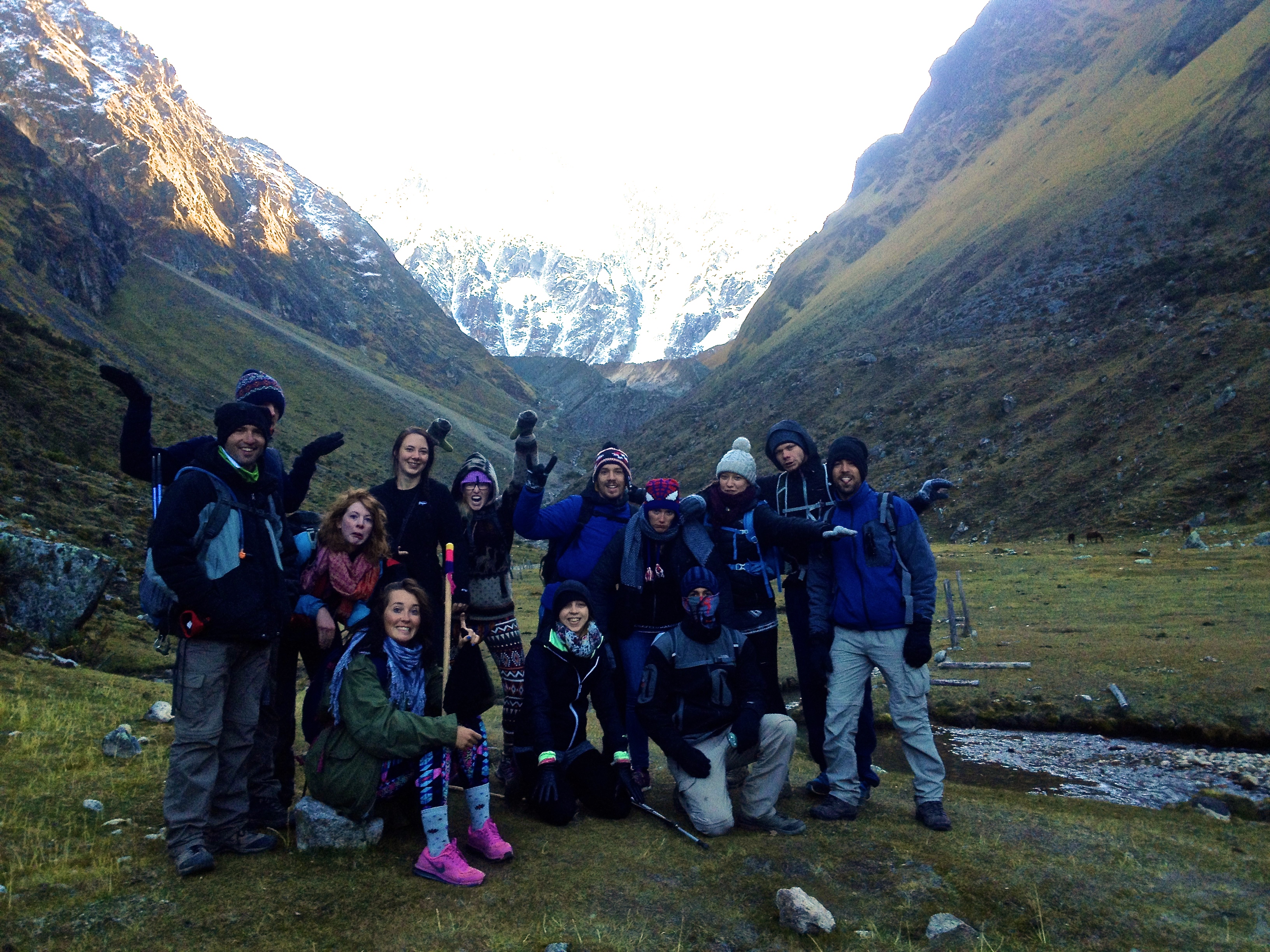 I came back out and hung out with our group a while longer at the table, shivering. Lior gave me his large jacket and I slightly resembled a blue marshmallow with the ridiculous amount of clothing I’d layered on. The idea of a fire was inviting to help bite out the cold, so I moved to the roaring fire to steal some of the heat. It was so lovely to be by a fire! I spend much of my summers back home fire side camping, and hadn’t been near a fire for ages. The blazing heat of the fire penetrated through my chills and I began to warm up. The advil must have started to kick in too. The first song to come on was none other than the Macarena. Every one of the girls squealed, jumped up and began doing the dance we all learnt when we were 10 years old. We started making a big circle around the fire and danced the entire song. I was roasting by the time it was over! Note to self: there is no better way to warm up than to put all your clothes on and do the Macarena next to a roaring fire for five minutes! I stayed as late as I could, trying to be social and meeting others from other groups, but I finally had to bow out around 11pm, which is an exceptionally late night for the Salkantay Trek!