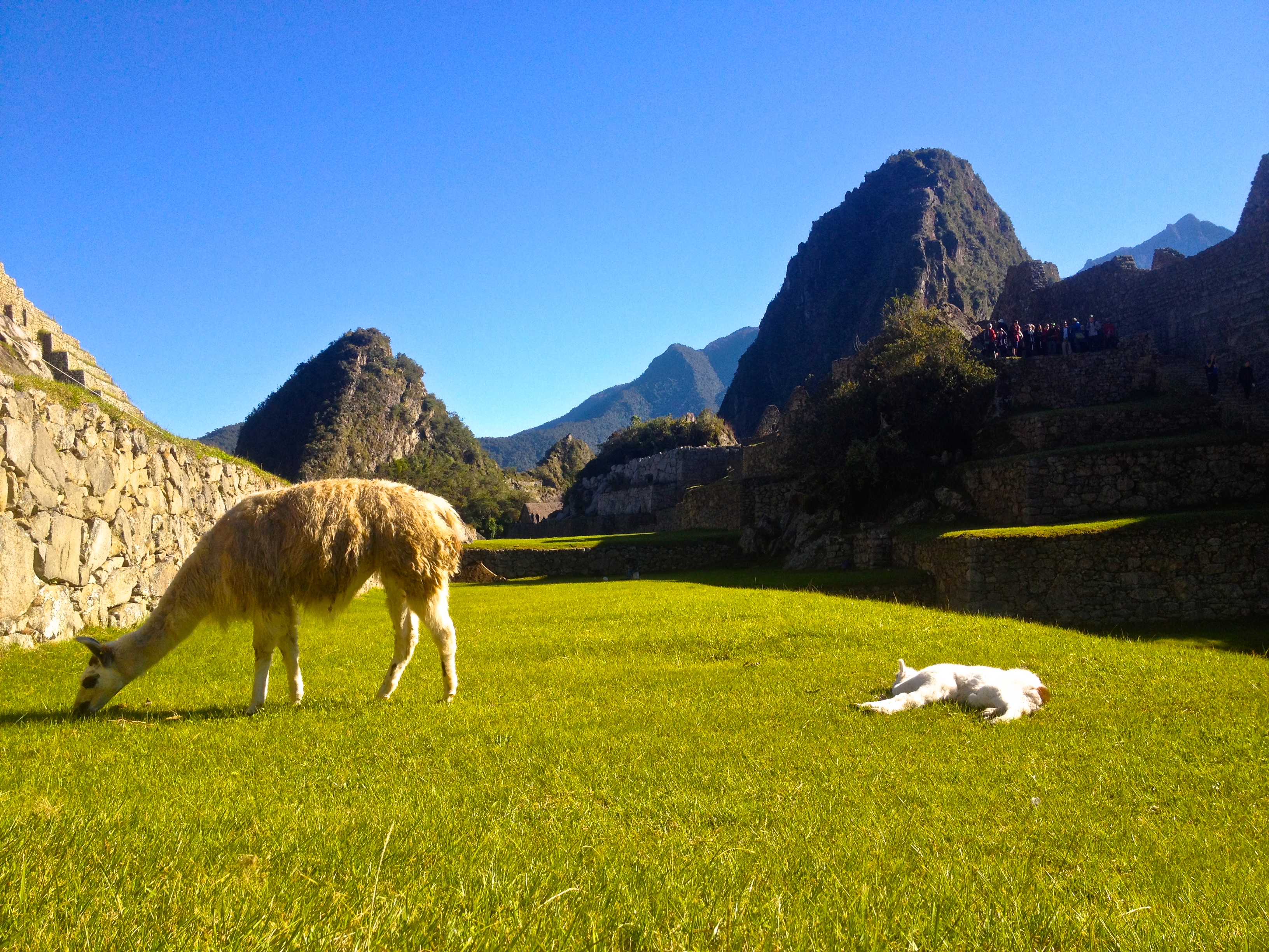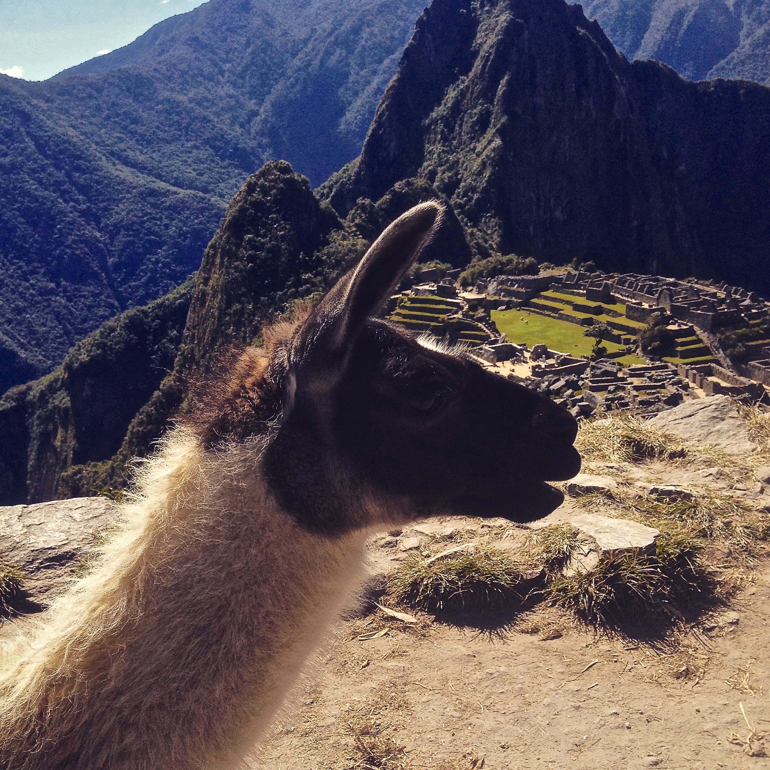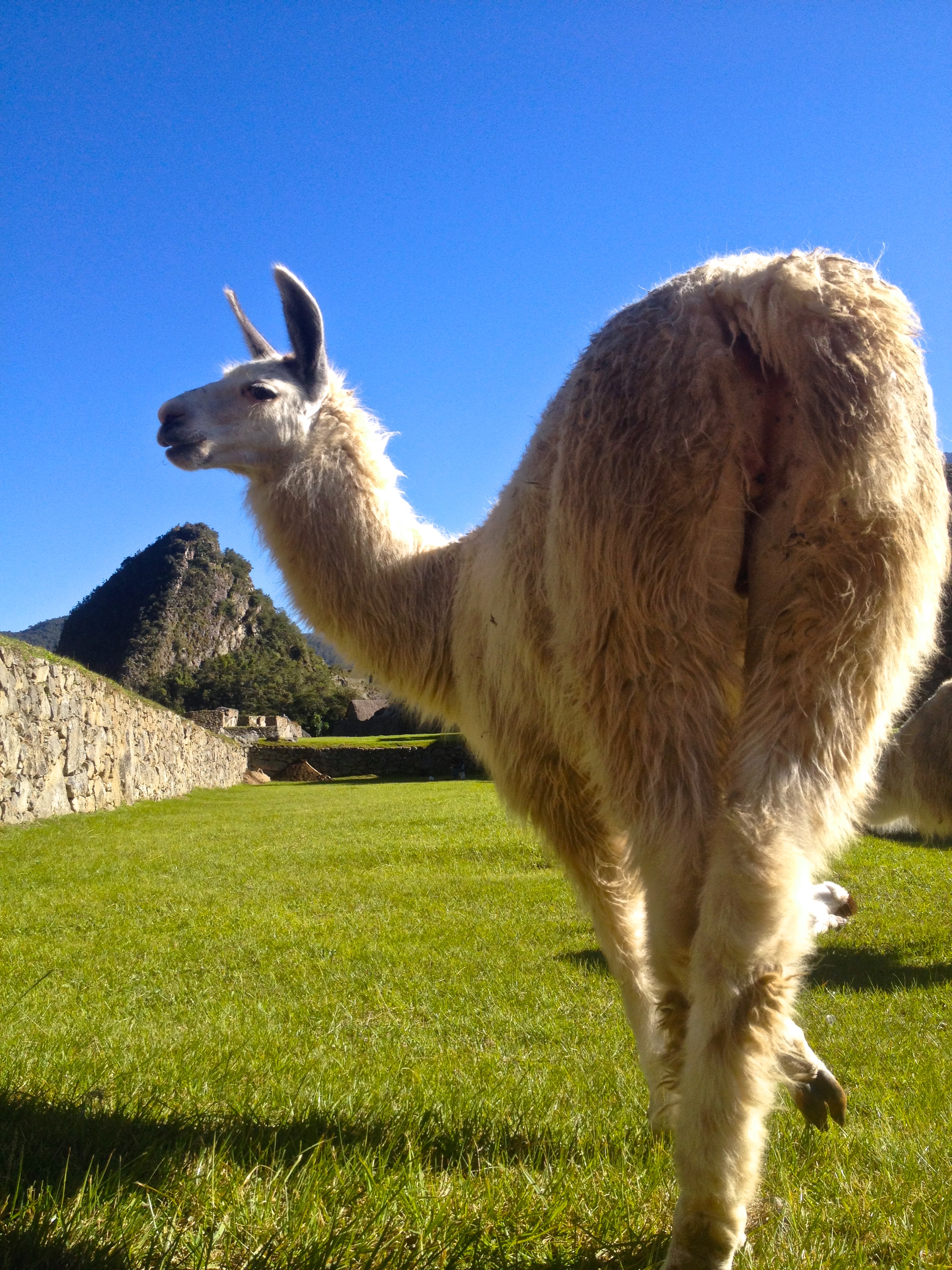 When I researched Machu Picchu and saw how old it was, I was taken aback. It’s only just over 500 years old. What’s the big deal? I mean, there are so many ruins all over the world, why are these among the most famous of all, a wonder of the world? Until you get to Machu Picchu you can’t understand nor appreciate why this place holds such a title. The way the surrounding mountains climb like reaching fingers all around the city, 360 degrees, their vibrant green slopes thick with heavy vegetation of the jungle creating a tremendously dramatic effect. The city seems as if it is cradled within the palm of the reaching peaks, a safe haven, exceptionally difficult to reach. To the left the high reach of the famous Huayna Picchu looked down on the town. Behind us in the distance we could see the snowy peaks of the mountains we crossed through in the Salkantay pass to get here. To the right Machu Picchu Mountain towered above the city. The grass was a lustrous green from all the rain this place receives. Once again, Pachamama smiled down on us and gave us a perfect day of sunshine and blue skies. Llamas – yes the famous llamas were here! – milled around and I realized how they kept the grass in check here- llama lawnmowers! The town was in exceptional condition, so perfectly preserved.