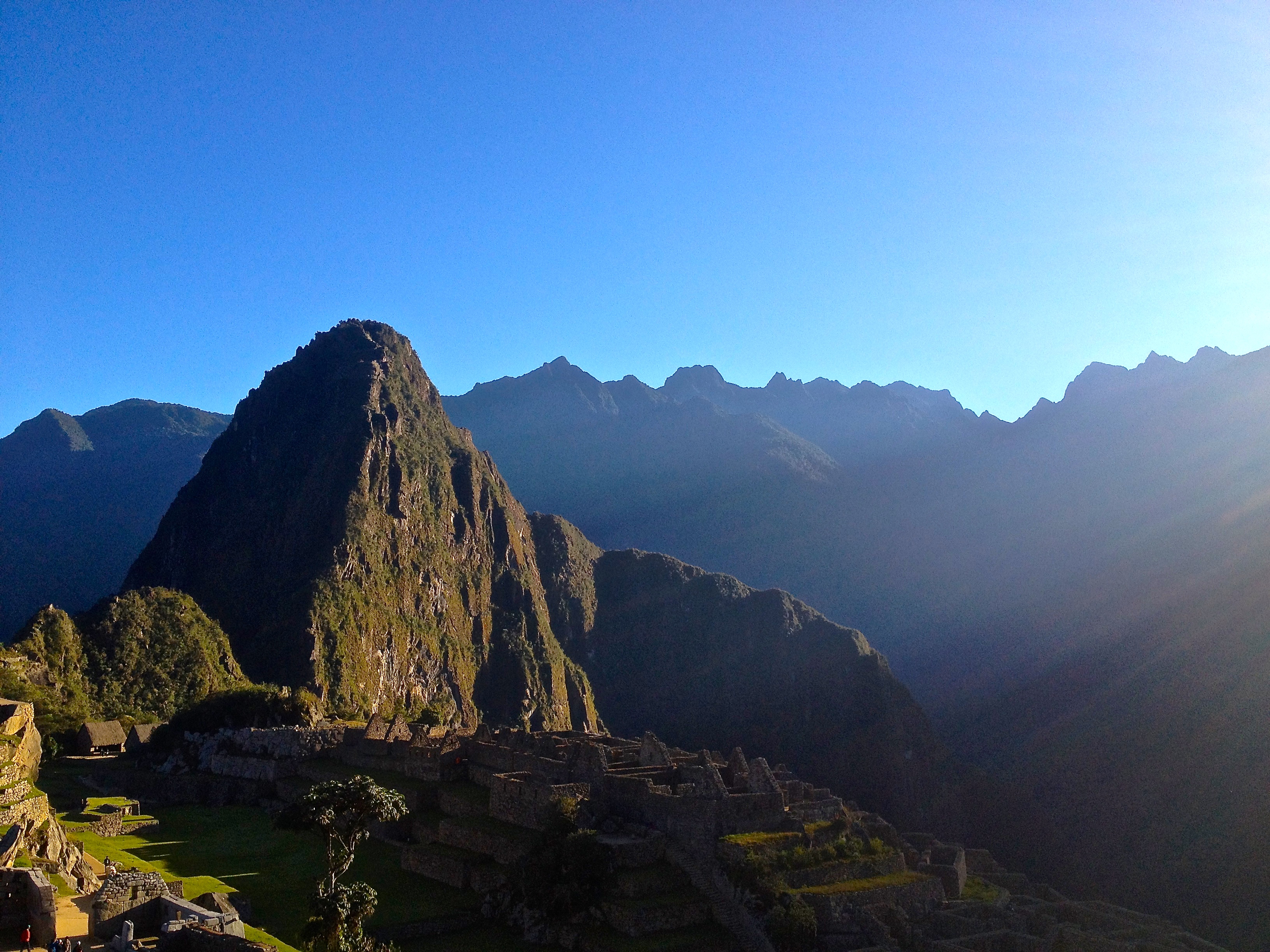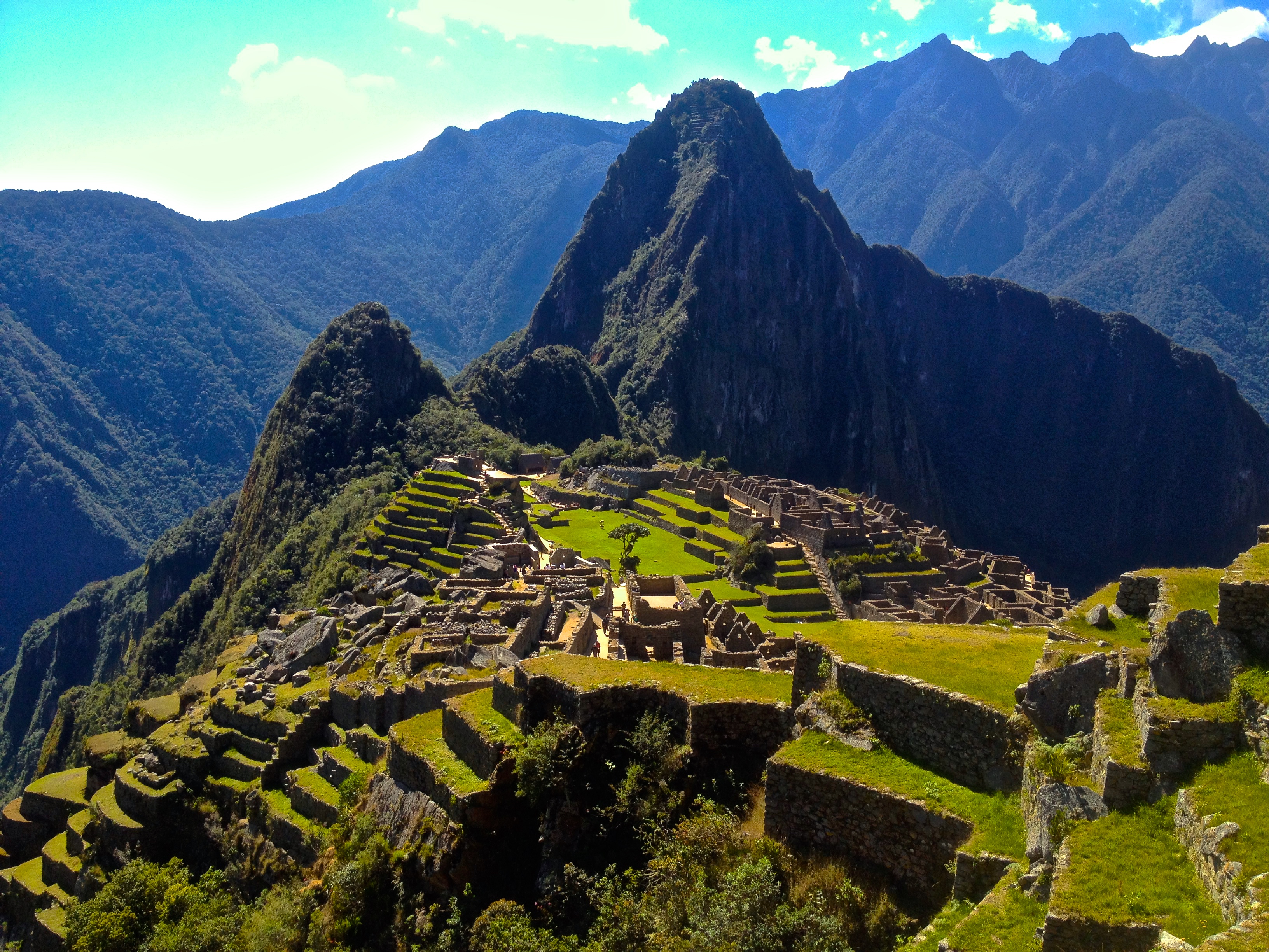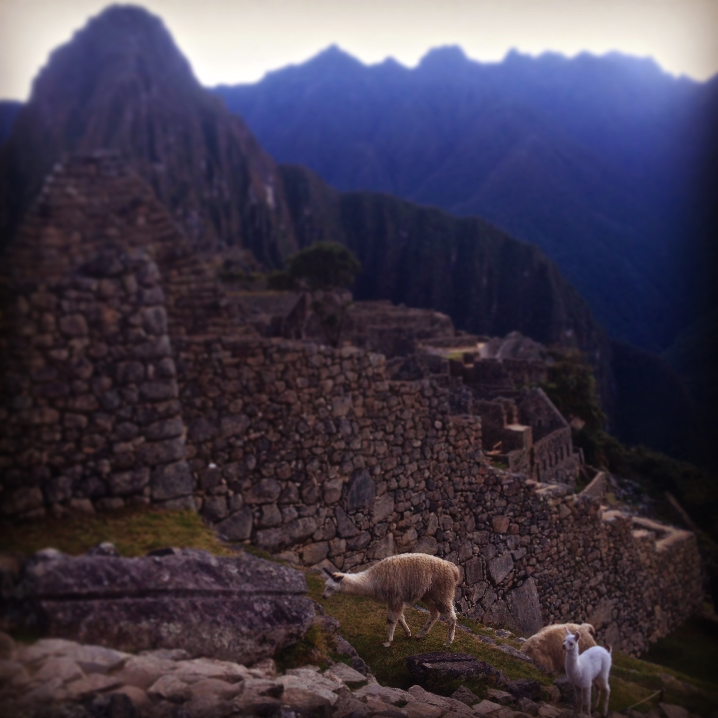 When I researched Machu Picchu and saw how old it was, I was taken aback. It’s only just over 500 years old. What’s the big deal? I mean, there are so many ruins all over the world, why are these among the most famous of all, a wonder of the world? Until you get to Machu Picchu you can’t understand nor appreciate why this place holds such a title. The way the surrounding mountains climb like reaching fingers all around the city, 360 degrees, their vibrant green slopes thick with heavy vegetation of the jungle creating a tremendously dramatic effect. The city seems as if it is cradled within the palm of the reaching peaks, a safe haven, exceptionally difficult to reach. To the left the high reach of the famous Huayna Picchu looked down on the town. Behind us in the distance we could see the snowy peaks of the mountains we crossed through in the Salkantay pass to get here. To the right Machu Picchu Mountain towered above the city. The grass was a lustrous green from all the rain this place receives. Once again, Pachamama smiled down on us and gave us a perfect day of sunshine and blue skies. Llamas – yes the famous llamas were here! – milled around and I realized how they kept the grass in check here- llama lawnmowers! The town was in exceptional condition, so perfectly preserved.