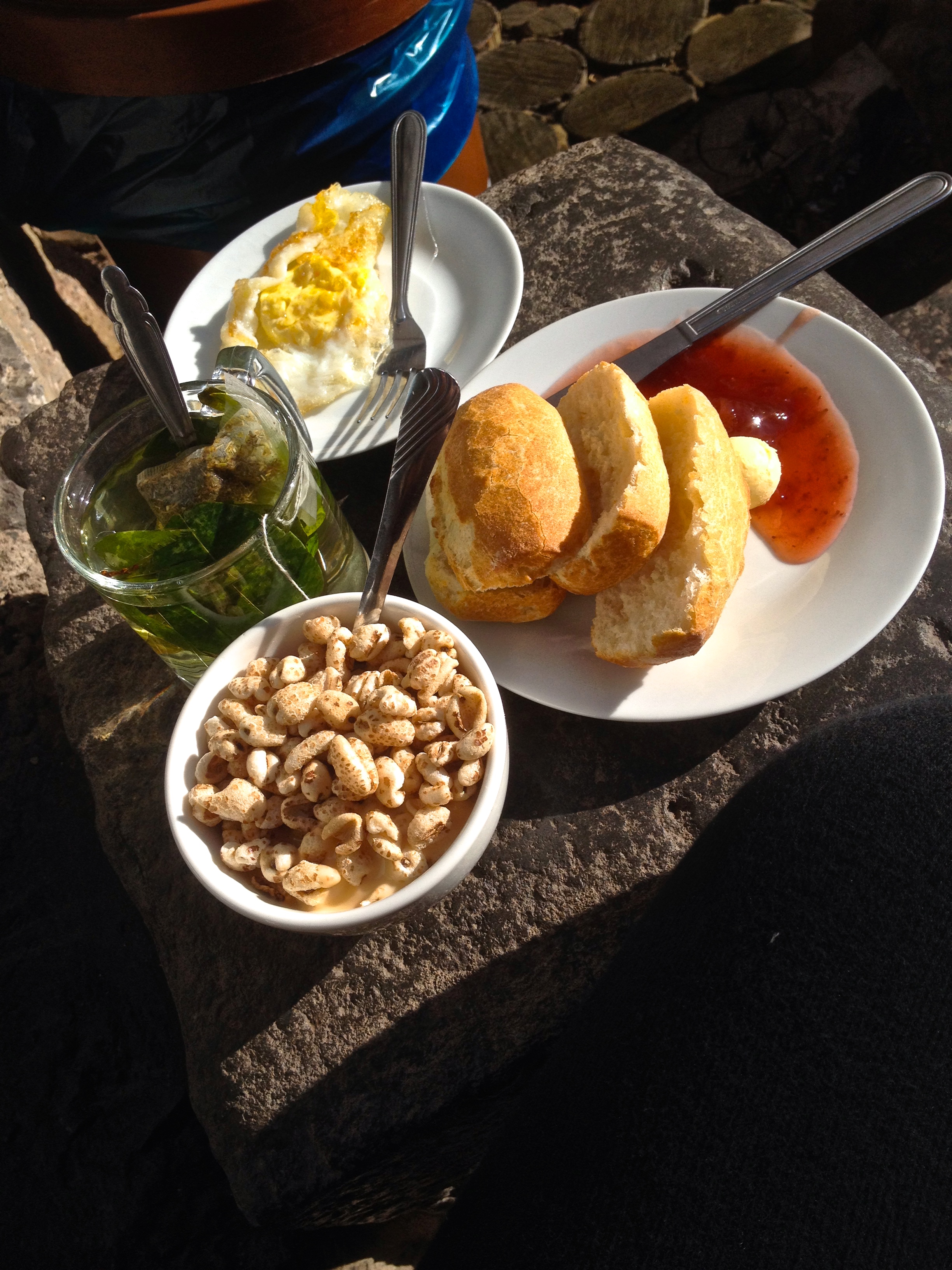 And at last, I could. I dragged my feet, very literally until I was close to the main tent and then just fell over and nearly cried for the 10th time that day, but this time in relief instead of pain and desperation. Holy shit. I made it. I don’t know how in god’s name I did it, but I made it. That was undoubtedly the longest two hours of my life, stretched into an insufferable eternity. It’s incredible what pain can do to your perceptions of time and sanity. Everyone had already moved into the tent to get ready for lunch but all I could do was take off my shoes to give my throbbing feet a moment to breath and stretch and stop the shooting pains in them. I didn’t want to eat, I didn’t want to do anything. I had told myself over and over that the second I got to camp I was crawling into bed. I hadn’t let on to anyone (other than Sally, and not even to Sally did I let the full extent of my struggle be known) how bad things were for me on that last half of that day. I tried to keep up the pretence and forced myself to join them for lunch. I didn’t feel hungry because I was so ill, but when they brought out the mouth watering lunch, my body suddenly remembered it was ravenous and needed fuel desperately almost as much as sleep. The ripe juicy stuffed avocados. The roasted chicken and hot rice. The beet and potato salad. The hot, sweet coca tea and the fruit juice. It was a feast. I couldn’t eat too much, not near half of what I would normally eat, but it did feel good to get a little something inside of me.