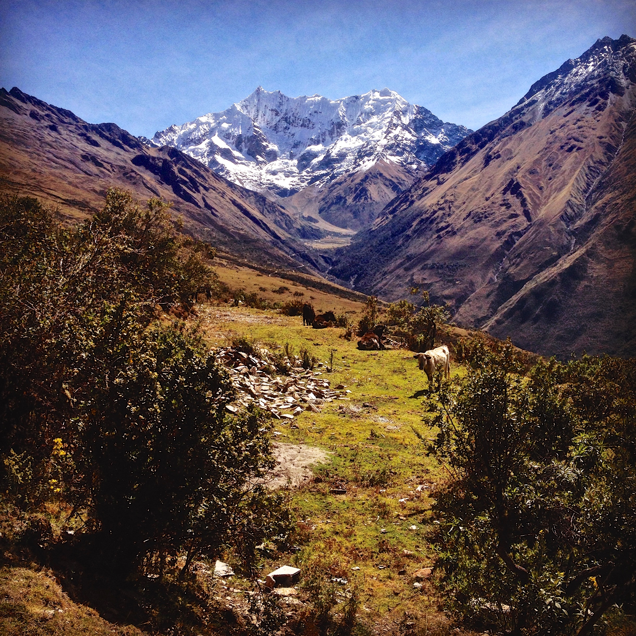 I savoured each step on that level ground, my body thanking me profusely for the reprieve. I was also at last able to concentrate more on the stunning vista surrounding me instead of staring down at my feet to place them in the right place as I trudged ever upwards on the uneven ground. It was breathtaking. I mean, the altitude and the exertion were quite literally, breathtaking, but I’m quite sure the beauty I was seeing also played a part in leaving me breathless! We lucked out and had perfect weather, and so thanked pachamama for this blessing. It was sunny and crisp, with hardly any wind. The skies were clear, hardly a wisp of could to be found on that big blue blanket above us. Vivid green pastures draped over the steep mountain sides all around us. Cows and horses dotted the hills, grazing lazily, adding life to the otherwise still scene. As we rounded a corner, the huge snowy capped peak of Salkantay came into view and we all gasped – what a vision! A small wooden gate made of old gnarled sticks laid in my path and as I crossed through it I was transported to the Shire and couldn’t help but lay down the first of five days of Lord of the Rings references.