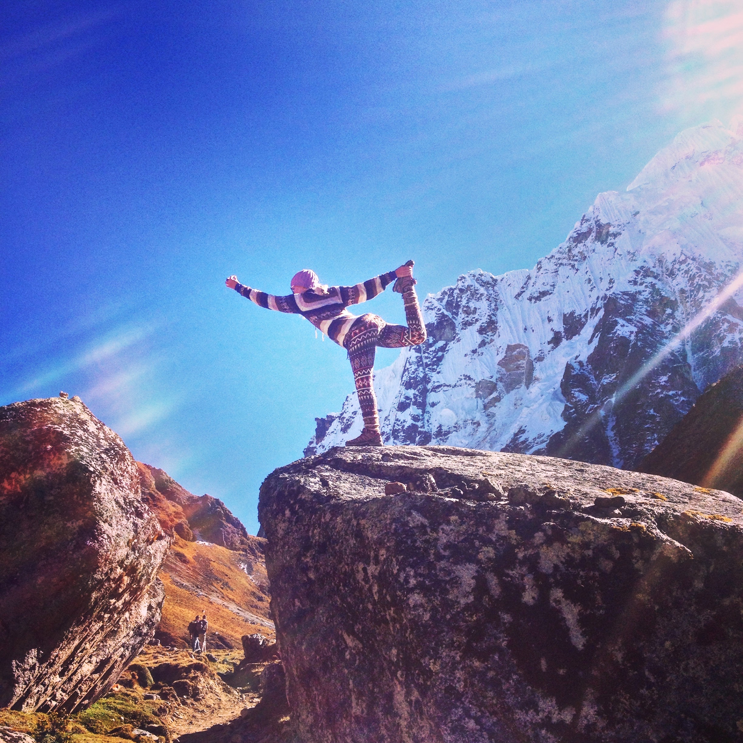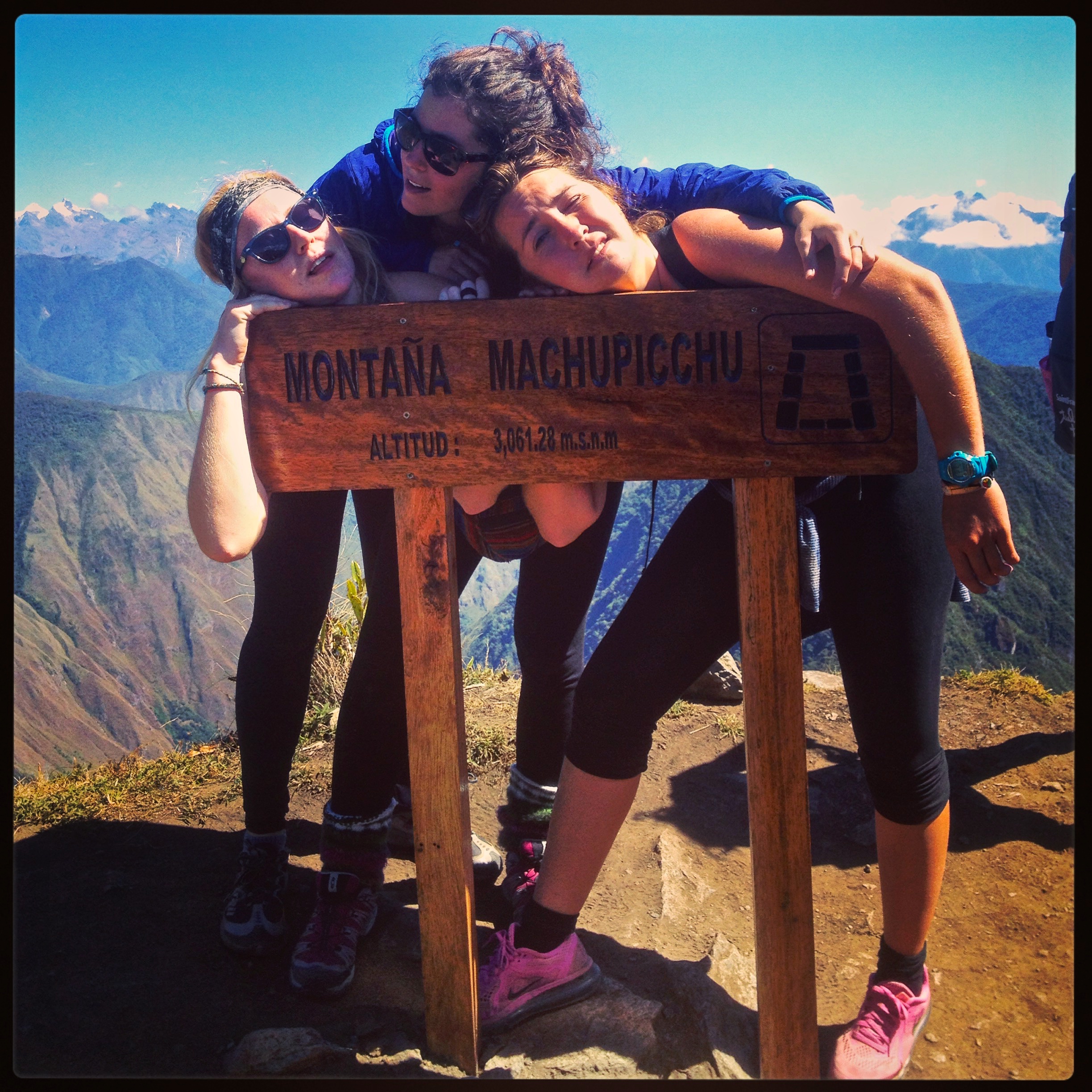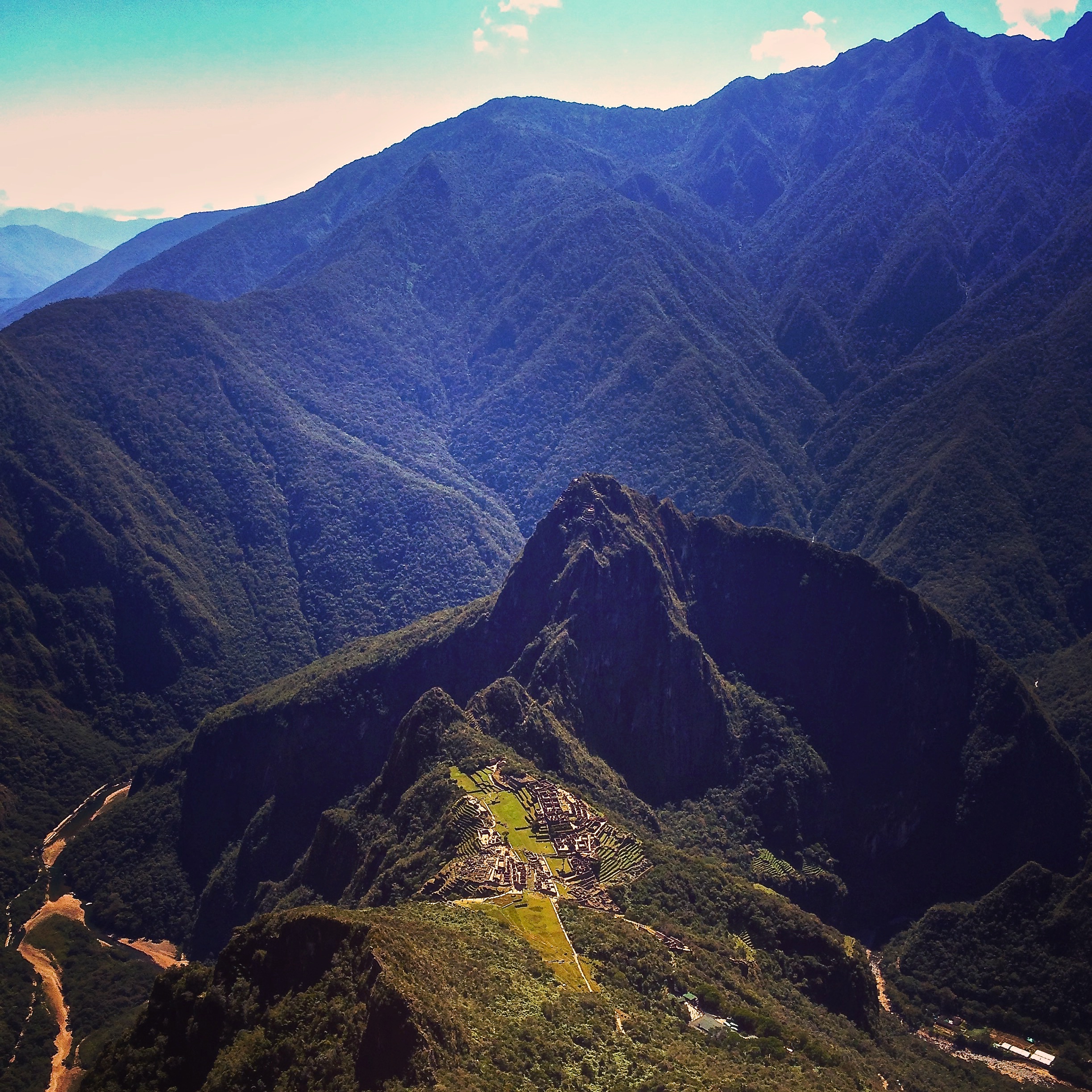This was a place I didn’t want to leave any time soon. My Machu Picchu experience was heightened dramatically by looking down at the city and the surroundings from up here. It gave me time to reflect on the journey of the last few days and to feel the energy from miles around me. Hawks circled and swooped around us. The wind blew strongly, the crisp breeze forcing us to put our sweaters back on after the sweaty climb. When I got close to the edge I felt the strange pull of vertigo and felt my world begin to tip sickeningly. The side of the mountain simply fell away into nothingness far below. I stepped back, respecting the power of the mountain and the altitude and let myself feel safe and grounded again a safe distance from the edge. It really did feel like you were suddenly on top of the world up here. We were higher at the Salkantay pass, but that was a pass- this was a mountain top and I was soaring above everything around me. I stayed up here for over an hour savouring the reward for the hard work I’d put in these last few days. I pulled out my journal and began writing, I chatted with friends, took pictures, stuck a yoga asana, stretched, relaxed and reflected.