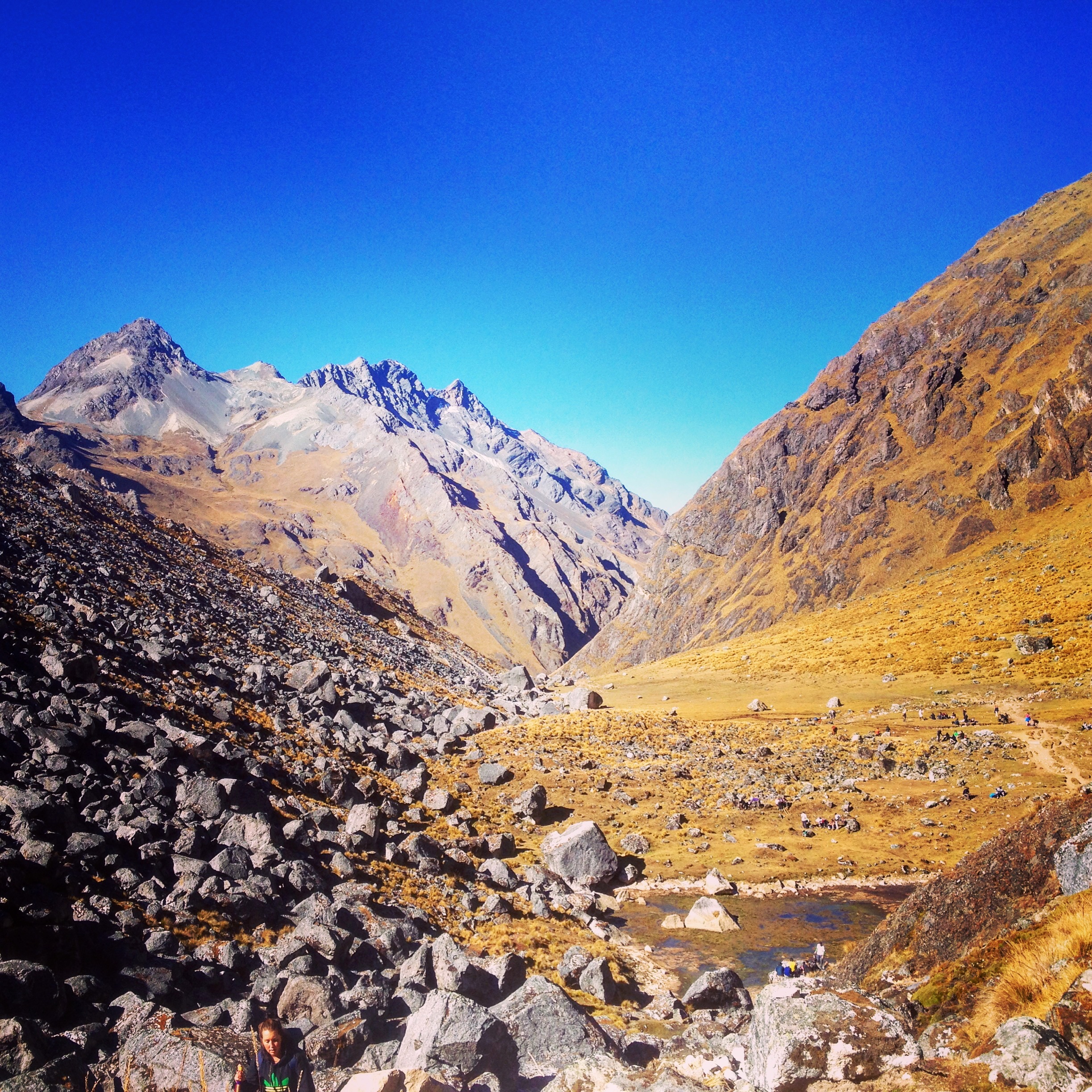 The horse ride was definitely a highlight for me. It was so incredible to be on this beautiful, strong animal for the first time, to let her pick her way through the trail and fully put my trust in her. It was so nice to be able to stare at the mountains surrounding me since the entire morning I had been staring at my feet to ensure that I didn’t twist an ankle in the rocky terrain we were summiting. It was only about 20 minutes on horse, but it was unforgettable. We got to the top of the Salkantay pass, with the staggering hulk of Salkantay mountain (which means ‘savage mountain’) on our right, and the backside of the beast of another mountain on our left. Ahead of us, our path fell away into the descent of the valley, loose rocks, and scree snuggled in between the sloping valleys. Behind us lay our conquests thus far. What a day this had been! We stopped for lunch an hour ahead. We feasted and talked about the morning – the struggles, the tears, and the victories. Our group all settled in for a nap on the grass (except me, I was too excited!) and then we pushed on.