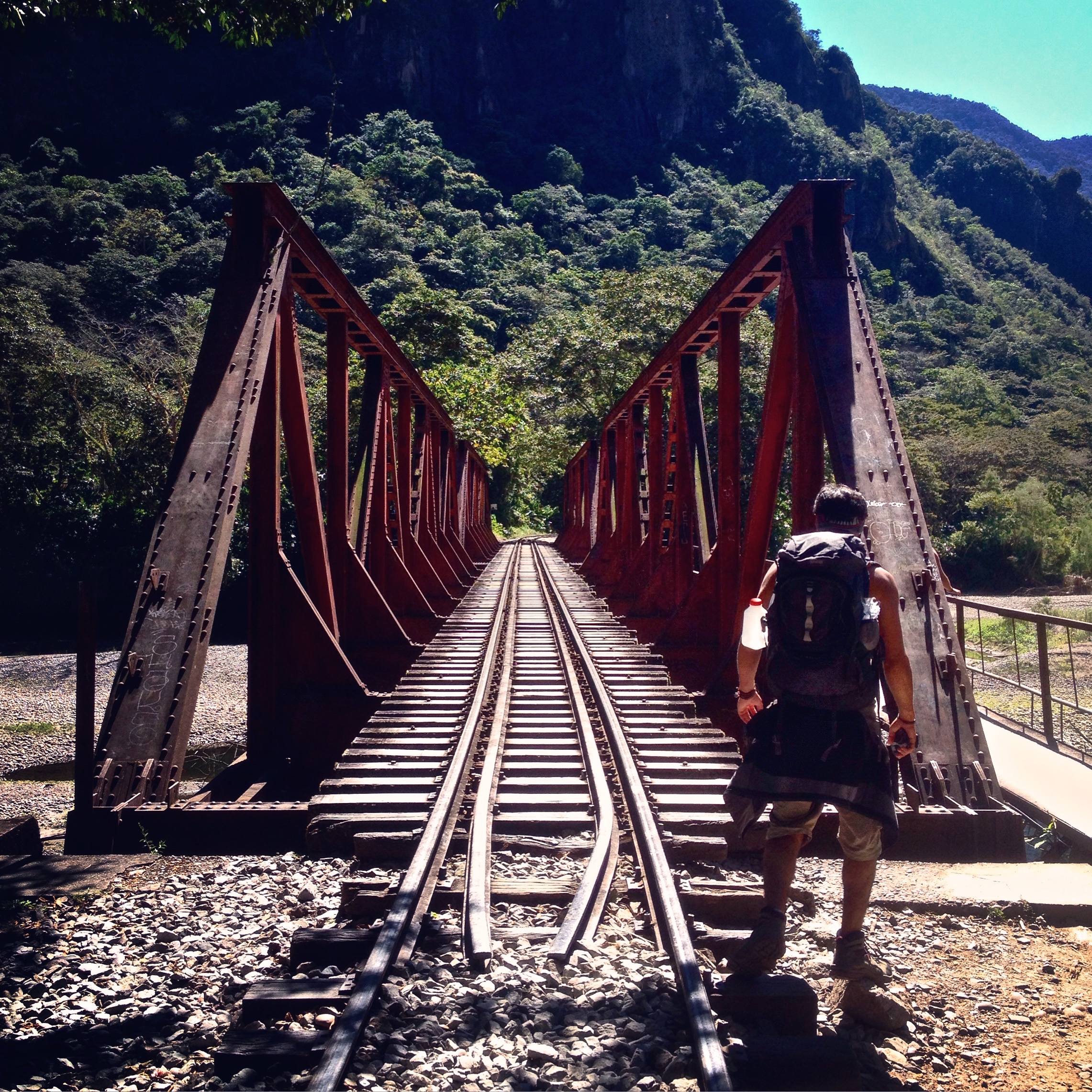 We had a three hour walk ahead of us this day, mostly along flat ground which our knees were grateful for. It was an easy walk, though after days of this, our bodies were pretty beaten and tired and it still took a lot out of you. The idea of having to do more than three hours was implausible, I don’t think I could have done much more! It was a beautiful walk as we were nuzzled deep in the mountains, and followed train tracks that wound through the peaks to Augas Calientes. I actually caught sight of Machu Picchu far off perched atop a mountain in the distance. Sally and I ended up starting out walking together, but she marched on when I took a break and she ended up taking the wrong path, following the train tracks, when the rest of us went down. It was around the same distance, but she ended up in the city at a totally different spot from the crew. I found all this out from a man at the intersection who told me which way she went, but advised me to be careful if I went that way as the train tracks go through a tunnel and if a train comes it’s quite dangerous. I opted for the safe route. I powered ahead and was among the first to reach our meeting spot, just wanting to get to the hostel and have my first real shower in four days. I’d been wearing the same clothes for four days, changing only my underwear and socks, and even that was a chore to change each day (when it’s that cold, you don’t want to take anything off!).
