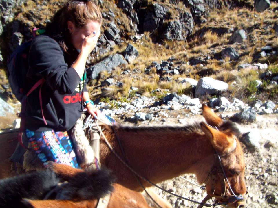 So, Sally doesn’t like horses. No, I mean Sally freaking hates horses. She told me a horror story from a couple of months ago in Cuba, where her horse tried to take the lead when they were riding and the horse her friend was on tried to bite Sally’s horse, but chomped her leg instead and left her with a nasty lump and bruise that lasted weeks. Needless to say, Sally now had a pretty bad fear of horses, but she was bagged, and we did our best to convince her it would be fine, so she finally conceeded. As we started off it was fine, but a few moments later things got a little hectic for Sally. The mules were working it out between them who was leading and it took a couple of minutes of them walking close by each other and then trotting to get ahead of each other. At one point all three of them started to run uphill. I grabbed on and began to howl with hysterical laughter, and Eve followed suit, and so did Sally. Or so I thought. It wasn’t laughter coming from Sally, it was hysterical crying. The poor girl! She was scared out of her mind, no doubt having awful flashbacks to the horse biting her, and was convinced it was going to happen all over. Luckily our horses calmed down and got their pecking order sorted. Sally had tears streaming down her face and was crying that she wanted to get off now. I did my best to help calm her down and tell her that was doing awesome and that it was going to be okay. She slowly started to calm down, but was still a tense, jittery mess the rest of the ride up.