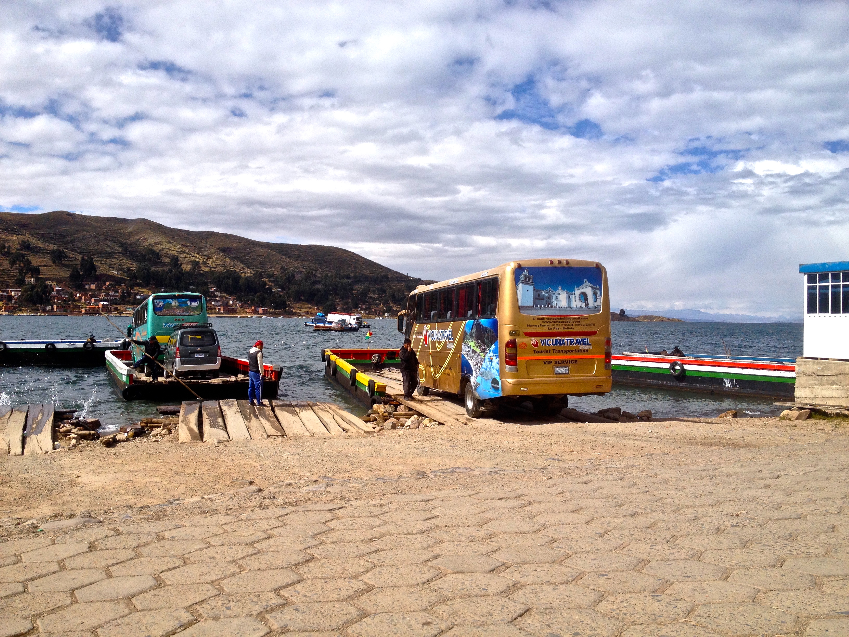 I caught a couple minutes of sleep here and there, but just prayed we would get there soon. The border crossing was a breeze and didn’t take long at all. We had to stop and take a bizarre ferry of sorts to cross over Lake Titicaca. Luckily people who had done this before were guiding us since our bus driver basically just kicked us off and didn’t tell us where to go or what to do. The bus drove on to a long barge like raft with a motor on it and we watched it perilously rock back and forth over the large waves of the channel it was crossing. It was pretty incredulous, and I was sure the thing would topple at any moment. I wondered how many buses were at the bottom of the lake…