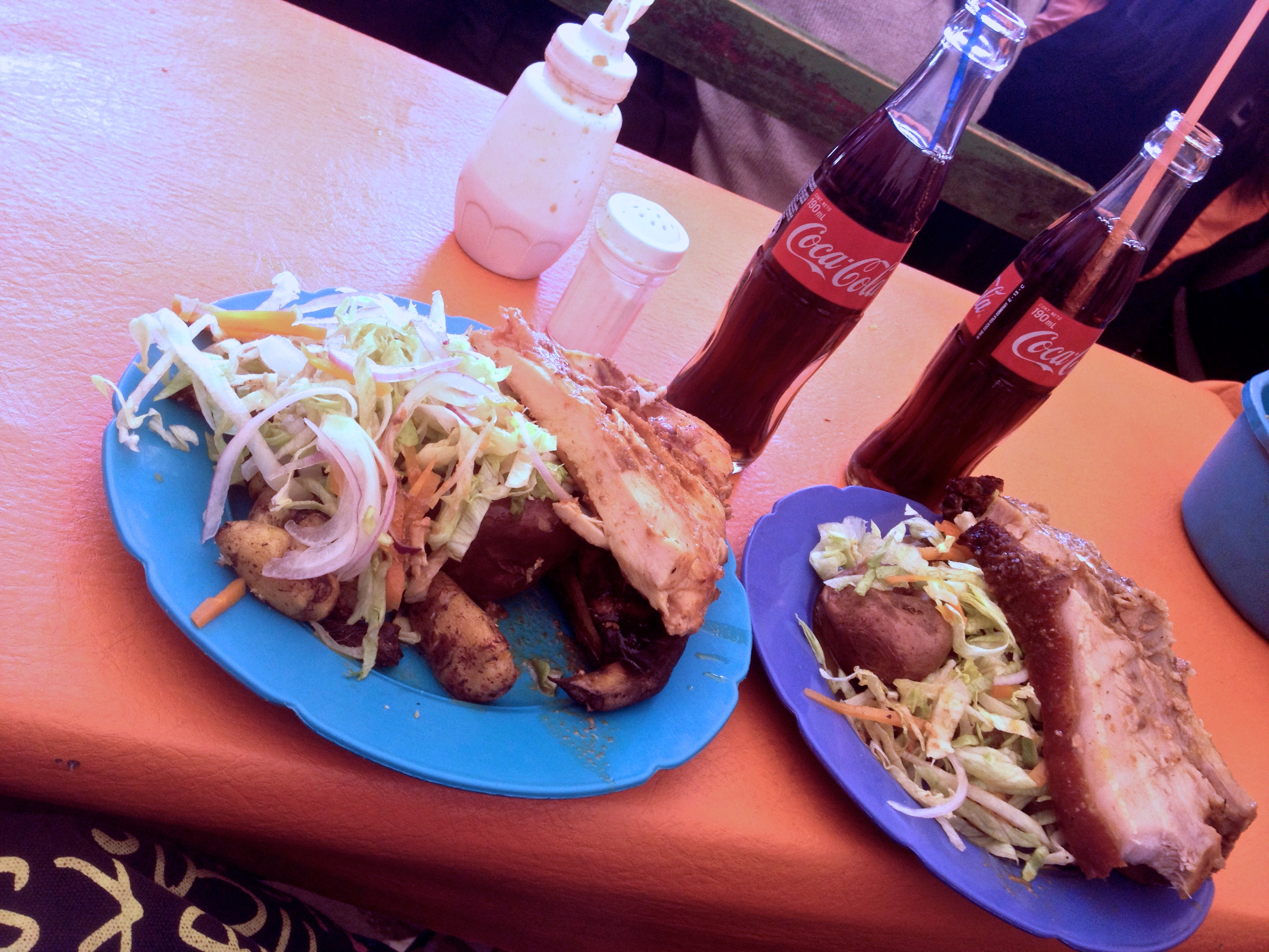 There were a few food stands, but nothing compared to most markets, and Sally and I found one that served chicken and pork, traditional Bolivian street food and sat down. I asked myself what the hell I was thinking. I was so sick, and just threw up the night before. And everyone said if you get sick anywhere from food, it will be Bolivia! I had so many warnings not to eat the street food, but it didn’t look any worse off than all the other street food I’d seen in my travels so I buckled down. I didn’t eat the raw vegetables because if anything was going to be contaminated that would be it. I devoured the yummy boiled plantain, my potatoes and the chicken- which was so juicy and tender and bursting with flavour. I was impressed! Also, I think if you wash it down with a coca cola that will kill anything for you!