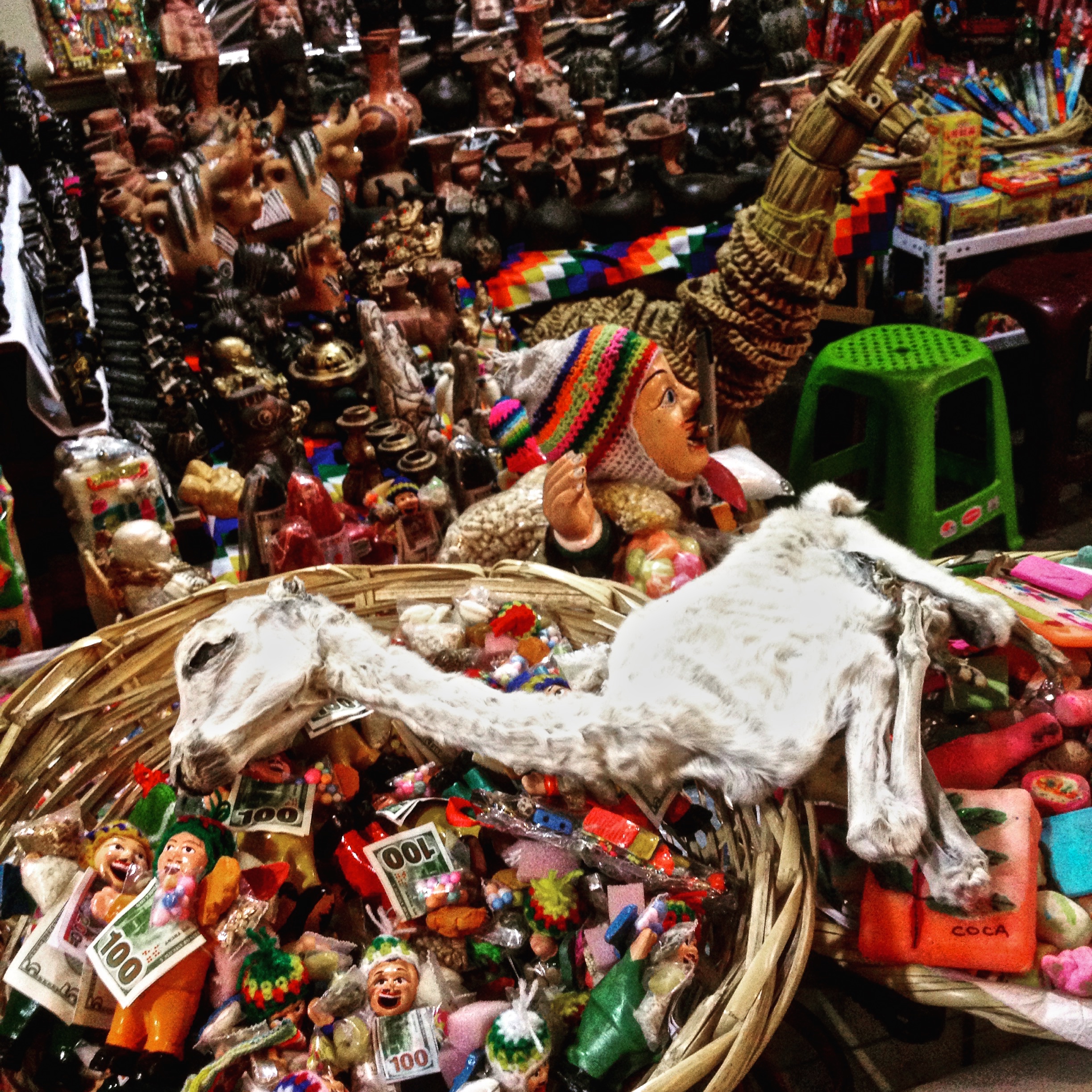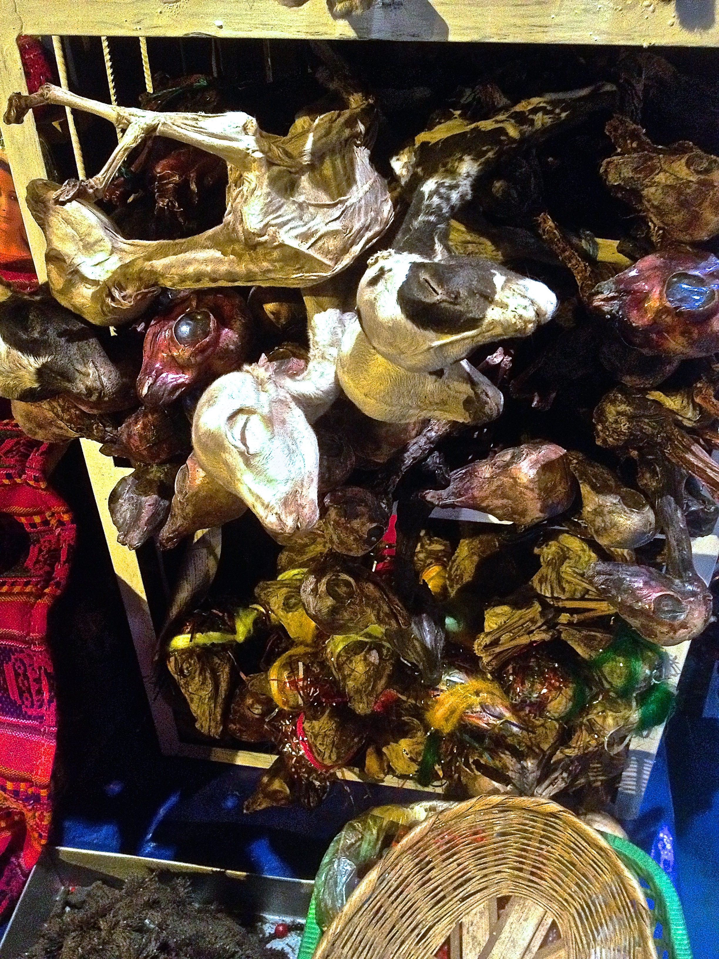 That night, Sebastien and I went down to wander the witches market on calle de las brujas. You have to check this spot out when you’re in La Paz. Like many things in Bolivia it’s simply bizarre and perfectly wonderful! Booth after booth, shop after shop all filled with dead, preserved llama fetuses. I’m serious… It’s tradition in Bolivia to give a llama fetus as an offering to Pachamama (Mother Earth)- especially when building a new home, on the first Friday of each month and in August. They say the fetuses come from miscarriages, still borns or when pregnant mothers end up slaughtered. I’m hoping this is true, but my god there are a lot of them!