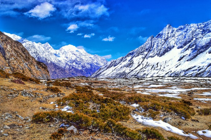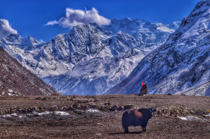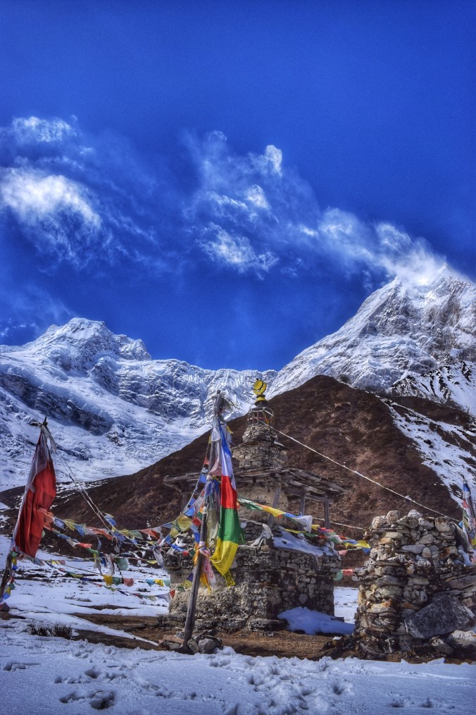 We were quite literally surrounded on every side by mammoth peaks – the great Himalayas. The uphill trek had flattened out into this expansive plateau at the top, a sanctuary of sorts as they say in the mountain world. From this vantage point we were able to take in the spectacular 360 degree panoramic view of the greats. I had lingered back from from our crew, Tek, Bhim, Travis, and Jan – taking photos of the yaks, and so I summited the last ridge before the plateau all by myself, with not another human in sight, and it quite literally took my breath and words away. Unabashedly, I admit that tears filled my eyes. How can one even begin to attempt to put into words the glory, the greatness, the majesty – the inconceivable size and beauty – that are the Himalayas? Few sights in my life have brought tears to my eyes like that. I was trying to understand what those tears meant. I felt happy, exceptionally happy. I felt like the world was speaking to me from her very core, her heart, through these, the tallest reaches of her hands. The beauty was overwhelming. To feel so small and insignificant, and yet to feel so honoured to stand at the feet of giants and have them cradle you in their eminence… it was a spiritual experience.