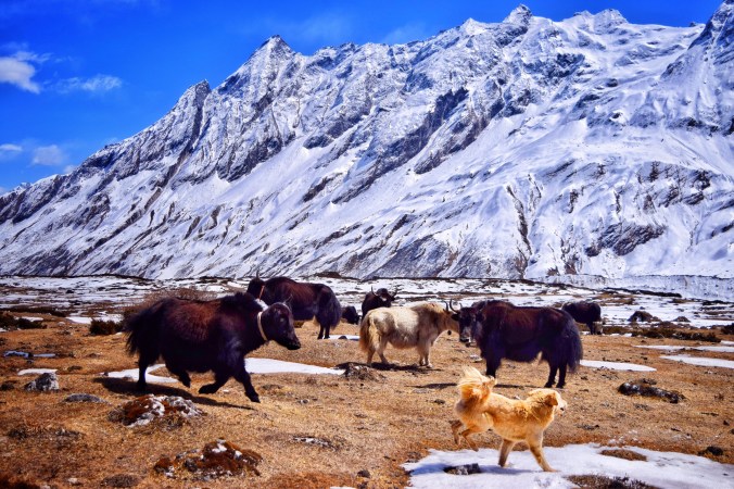 We trekked three more hours all uphill, steep and beautiful, and a challenge in the thin air up here. Not to mention that whole not sleeping thing! But I just took the trek slowly, and eventually we got there – there was no rush. Most people who were staying in the village were making this same trek today. Some chose to stay behind and rest, but many decided to trek up – it’s beneficial to acclimatize by trekking higher and then returning a bit lower as a day trip, so I wanted to make sure that I did this, even on no sleep. As usual, we were the last ones to leave the tea house so we had the trail all to ourselves aside from passing a few folks on their way back down. And all the while, the dog followed along with us, perhaps because I had been giving him some good loving and belly rubs this morning! I asked Tek if the dog had a name, and he responded, “Maybe”. So naturally, we dubbed our new friend Maybe. His amber coat was thick and he looked like a mix of a chow chow with a retriever. He was a devilish little rascal and while he kept close to our heels, whenever we came near the yaks, he took off after them to terrorize them. He just wanted to play so badly! But the huge horned beasts wanted none of it! They kept charging at him when he got to close with his nips and barks. The little trouble maker!