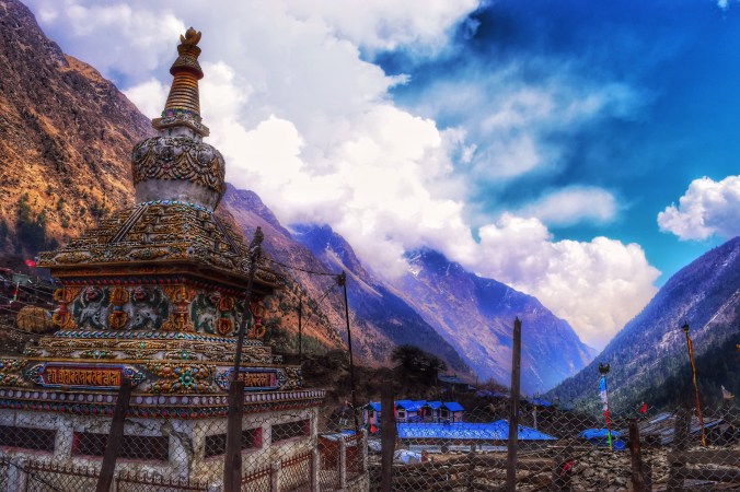 After the defeat of no leg warmers, we decided to keep walking in order to try and keep warm and so headed up towards the monastery on the hill. It was a brief ten minute walk uphill but I could definitely feel the altitude and my chest was huffing and puffing as I gasped for breath. To our luck, there happened to be a Lama visiting the monastery who would be giving a lesson inside, so we sat around outside waiting for his arrival along with a large crowd of locals and monks. Two at a time, the monks began to blow into large conch shells and the deep howl reverberated off the mountains, the long call lasting a minute or more. It was to call anyone who wished to hear the lesson to come, as soon the visiting Lama arrived and everyone piled into the monastery to sit on the floor, including Jan and one of the Aussie’s that was on the trek. Travis and Bhim and I waited outside as it was absolutely packed inside! The Lama was speaking Tibetan so even Bhim was lost as to what was going on in the lesson and couldn’t tell us anything. Once folks were settled, the Lama began chanting and everyone joined in. He then began his lesson while the monks handed around a case with smoking incense. The room began to get rather smokey so the monks passed it out to Bhim and said something to him in Tibetan. I looked at him and he looked at me, both of us absolutely baffled. He shrugged his shoulders and then took the urn towards this outdoor oven, hesitated momentarily, looking around nervously and then dumped the smoking incense into it, then handed it back to the monks inside who looked at it and Bhim confusedly and shrugged in turn. Bhim and I stifled our laughter and had to walk away from the monastery because we couldn’t stop laughing about what just happened and had no idea what was going on! Maybe he wasn’t supposed to dump it all out?! We’ll never know.