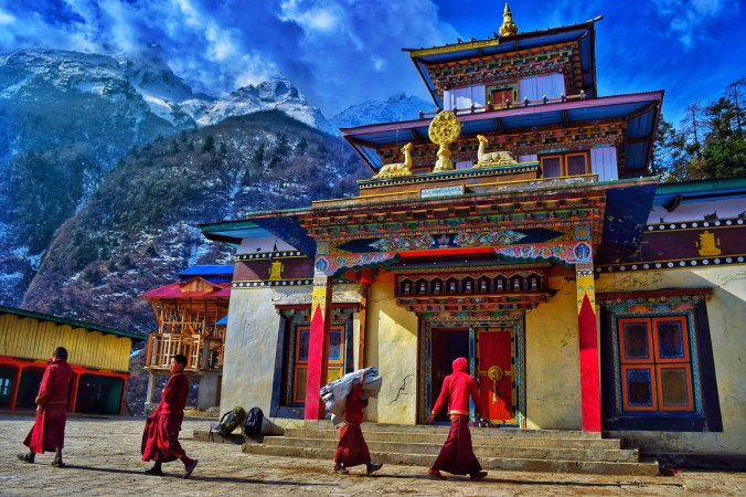 As I was squatting by the fire, sipping my milk tea prepared by the Monastery cook, I marvelled at the moment. One of the fellows was a monk in maroon robes, one was the cook and the other was wonderfully out of place – he had his hair in an afro, an old bleach job still visible on his ends. He wore a ball cap that read ‘dope’, a plaid shirt and heavy, gaudy jewelry. This made them quite the motley crew! And then of course Bhim, the young porter and us three Canadian trekkers, freezing up in the Himalayas, gratefully accepting the generosity of the cook and his tea and fire. He offered us Tibetan tea afterwards- which we had not had yet on tour trek. It’s a salty buttery tea – it was very strange and tasted like soup broth rather than tea- which plays a trick on your mind when you’re expecting something sweet or bitter and you get the salty buttery broth instead! It was Bhim’s first time trying it too and he loved it! Because of the the butter, it has a high caloric content and is often drunk in the Himalayas as a form of nutrition and is always offered to guests.