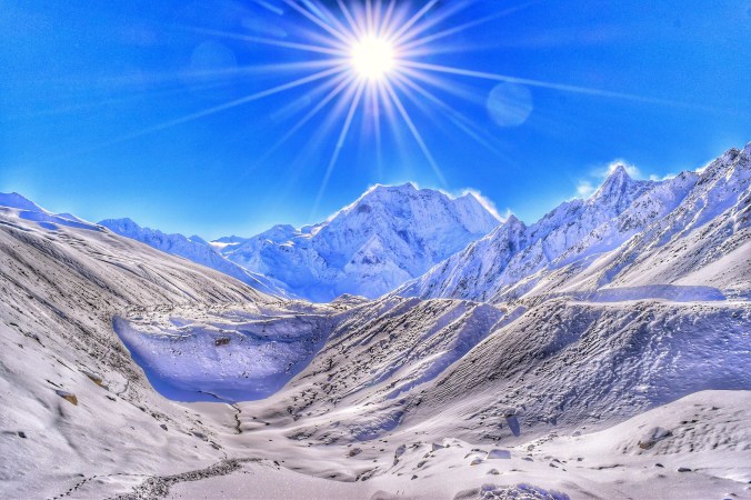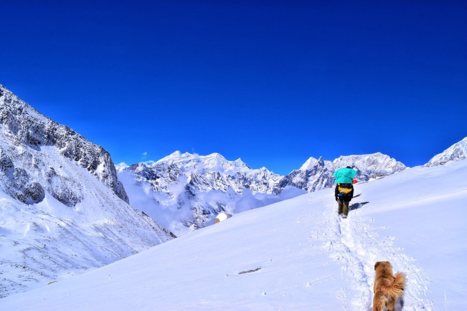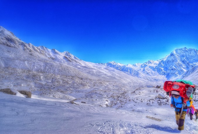 I didn’t want anything to do with Travis after our spat- I wanted space. I was exhausted, cold and scared, and I had to deal with it alone. I was nauseous and dizzy and still struggling to breath while we got ready. I couldn’t eat breakfast because I felt so sick. I knew I would need the energy from the food, but I was on the verge of throwing up. Luckily I had power bars and beef jerky and snickers (all treats I had lugged around since we departed Canada for this very reason!) so I knew I would survive without the gruel porridge that was breakfast. Jail slop as Travis called it. It was awful. I couldn’t even drink my tea. After breakfast we geared up and got into the back of the line of about 50 trekkers, porters and guides, everyones headlamps aglow in single file slowly trudging up the mountain side through the newly fallen deep snow. I couldn’t believe we were actually going, to be honest. I thought for sure after all the snow they would turn us back. But sometime in the night, the skies had cleared, the snow had stopped, and we had a day of absolutely perfect weather ahead of us. So aside from the snow we had to trudge though, the guides decided to push on – and they had the worst of it- it was their job to go ahead in teams of two and break the trail…!