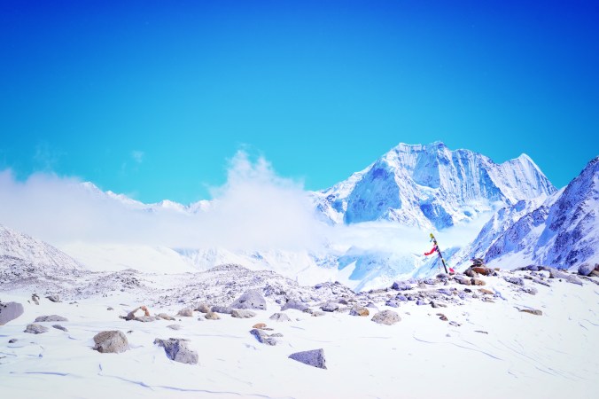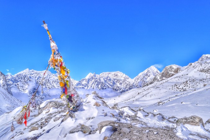 It’s hard to keep hopes high in this place. It’s utterly desolate. It reminds me of the barrens of Baffin Island. The snow is blowing around wildly, and all that stands here in the middle of nowhere at this absurd altitude is a couple of old stone buildings that make up this camp – there is no village. This one man lives up here all trekking season to cater to the trekkers. The toilet building is full to the top of shit overflowing and frozen into a two foot poo-mound. Any bathroom breaks have to be taken in any place you can find away from the building, without any hope for cover as it is barren here. But hey, we all made it! Everyone is here – all trekkers who started this trek around the same time and have been on pretty well the same schedule. We hardly ever see each other on the trail, but we always see each other at the tea houses at the end of the day so we have all come to know each other more or less by our nationality. Everyone is sharing their ailments, excitement and anxieties; the energy is intense and palpable – especially with the added stress of whether or not the weather will break and we will be able to make the pass tomorrow…