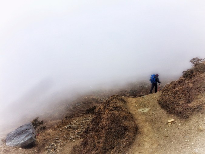 Around 9am, we ended up setting out earlier than we had hoped to leave – sadly there was no sun, so the tea room which was lined with windows was a cold prison instead of the greenhouse it was the day before. We might as well be cold at our final destination rather than stay put and be cold here. Plus it looked like some heavy weather was coming in. With no working toilets, no sunshine, and no other trekkers, the pace had become desolate. On top of that, I had a bit of anxiety in the morning, knowing how high we were going, and not knowing if we would be sleeping in a tent or not. The trek was hard. I would classify it as the hardest day yet due to the altitude. It was all uphill and we had a huge gain in altitude to make today, over 700m in just three hours! My lungs were killing me, my asthma acting up, so I took it very slowly, sucking on my puffers every break. A few sections were really steep, so I kept my head down the whole way up them so as not to look up and see how far I yet had to go. It was a struggle, the entire three hours. My arms and legs got unbearably heavy, and every step felt like hell. But we made it. And Bhim succeeded in getting us a room! Needless to say everyone was baffled as to how the hell we got a private room with beds, since we were the second last to show up (Crafty Canadians, they called us!). We lucked out big time because the shared dorm room didn’t even have beds, just mats on the rocky floor, and the tents were small even for two people and definitely let in a draft of snow through the bottom. I can’t put my gratitude to Bhim into words!