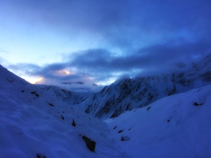 It was all so surreal. It was barely 5am, and all I could see is a what looked like a glowing worm snaking its way through the snow in the dark predawn air, as our head torches lit the way for us. A pale blue glow was appearing behind the huge mountains behind us as the sun prepared to arrive.