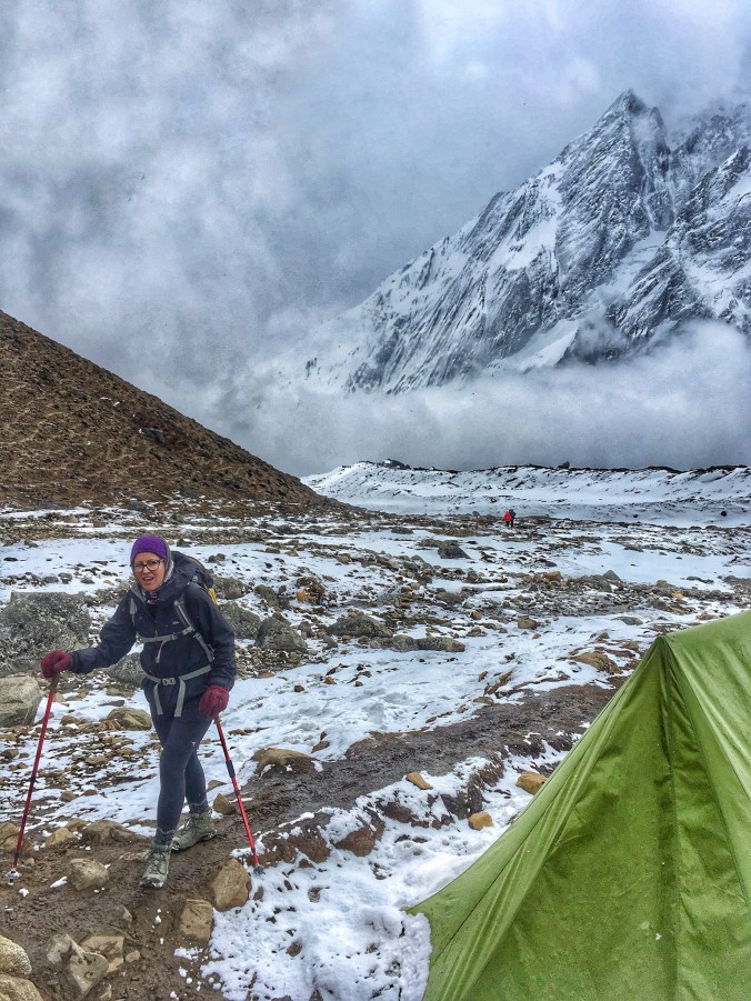 When we got to camp we immediately took off our sweaty clothes and changed into dry ones, shaking and freezing and stamping to keep warm as our skin was exposed to the cold. We set up our bedding and piled on all the clothing we could find and made our way to the tea room with the rest of the entire crew. We arrived around noon and so now had a very long cold day ahead of us. We have been playing cards religiously, over and over for hours, taking breaks to warm our hands. Everyone is talking about tomorrow. It’s the final push, the big day. A 700 metre altitude gain, a four hour ascent, and then three hour steep descent, descending over 1300m..! Ouch! The plan is to depart at 4:30am to beat potentially bad weather. Personally I am more worried about the up than the down, as my asthmatic lungs are having a hard time in this thin air. Downhill of course has its challenges and it hurts like hell on the knees, but hey, Advil! It will definitely be nice to get back to 3700m and be able to breath easier and not have so much anxiety about altitude sickness. But I’ve come to a sort of peace with myself and my anxieties – we have made it this far! Sure, tomorrow will be impossibly hard and feel like the hardest day of my life, but we’ve come this far and just have to get through tomorrow!