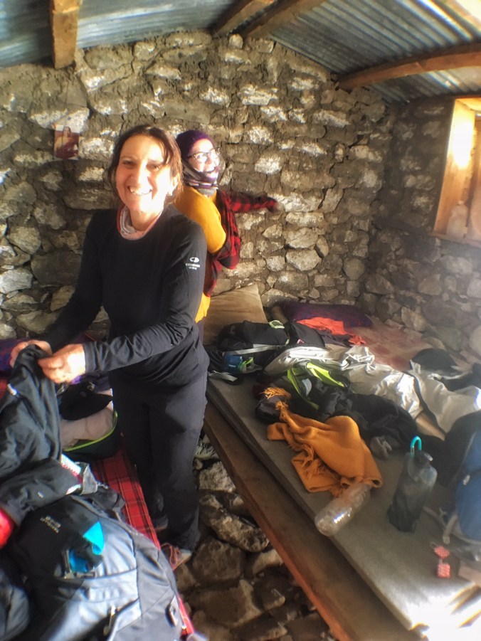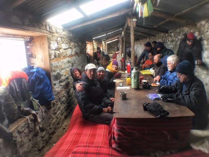 The tea house was the best we had seen on the trek so far – it had stunning little new cabins instead of hotel style rooms, and the common room had a wood stove! We all tore our wet boots and drenched socks off (and took them to the wood stove which now had a pile of boots and socks around it), changed out of our sweaty clothes into dry ones, and went to the common room for a celebratory drink and popcorn. WE DID IT!!! Everyone was excitedly talking about the day, how hard it was, how fun it was, how exciting it was, their favourite part etc. But one of the Danes, a fellow my age was complaining about his eyes – they were shockingly red and strained and he was having trouble seeing. As the hours went by it worsened and we found out that he didn’t wear sunglasses on the pass. We were 5100m up, for 12 hours with the sun reflecting fiercely off the snow… The poor guy was snowblind! Bhim hadn’t put any sunscreen on his face and his whole face ended up peeling off a few days later the poor guy! And so while we all made it, it wasn’t without a few struggles and injuries. But nothing could bring down the feeling of accomplishment and victory! Except of course utter exhaustion…! After a delicious meal we headed to bed early; we still had a few more days of trekking left!